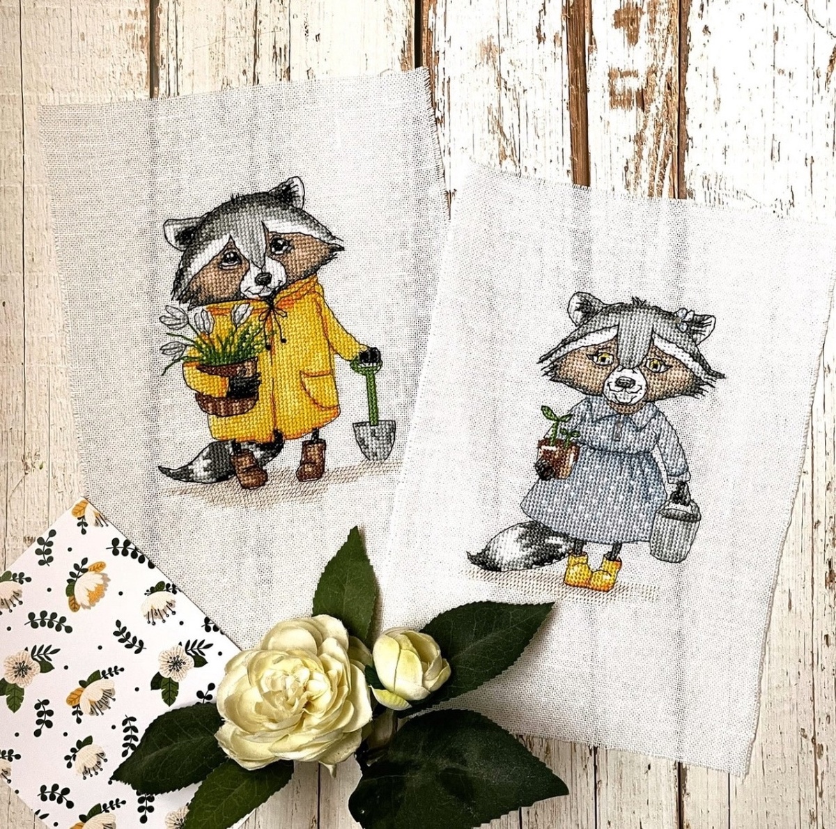 Бывает так: смотришь на готовую работу — и сердце радуется. А потом вспоминаешь, как ты это вышивал(а), и немного передергивает. Сегодня хочу рассказать вам про две такие работы — милейших енотов-садовников, которые и по сей день украшают мой балкон весной. Но… у этой красоты есть своя цена.