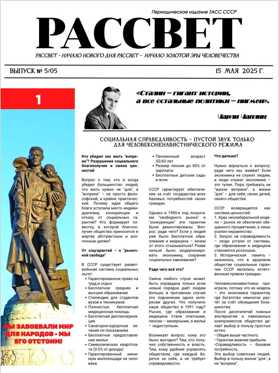 Анонс нового выпуска газеты «Рассвет» №5/05 от 15 мая 2025 года Главная тема: «СССР: Возрождение справедливости, технологий и суверенитета» Ключевые материалы выпуска: «Сталин – гигант истории, а все остальные политики – пингвины» — Анализ роли И.В. Сталина в мировой истории и актуальность его идей в борьбе за социальную справедливость. — Интервью с академиками о восстановлении Государственного Фонда имени Сталина. «Красный флаг над Вашингтоном: Почему мир возвращается к идеям СССР?» — Обзор протестных движений в США и Европе, требующих бесплатной медицины и образования. — Цитаты Александрии Окасио-Кортес и Берни Сандерса о советских социальных гарантиях. «ГКЧП СССР: Законная власть в действии» — Эксклюзивные документы: Денонсация соглашений с ВОЗ и возврат к советской системе здравоохранения. Введение золотого советского рубля (ЗСР) и компенсации гражданам — 9000 ЗСР на человека. — План восстановления обороноспособности: казачьи формирования, военная мобилизация, пограни
