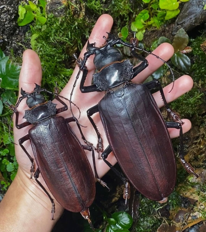 Дровосек-титан — южноамериканский вид жуков из семейства усачей. И это, возможно, крупнейший среди известных науке жуков: его длина от 17 до 22 см. Титан, как и все его собратья, является важнейшим утилизатором гниющей и мёртвой древесины, питается корой и листьями. Во всем этом нелёгком труде ему помогают мощные челюсти, настолько мощные, что могут перекусить карандаш, да и палец тоже запросто покалечат, если его совать куда попало. А еще у жука очень мощные лапки с большими крючьями, которыми они могут рвать плоть и душу врагов своих в клочья. Одним словом мирные создания и человеку их опасаться абсолютно незачем.
