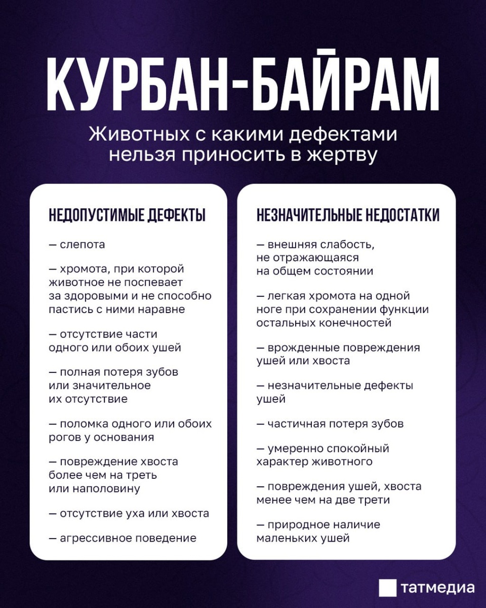 В ответ на пост 🐏❌ Курбан-байрам: какой скот нельзя закалывать по случаю праздника Принесение в жертву животного – один из важнейших обрядов, совершаемых во время праздника Курбан-байрам, который в Татарстане отметят 6 июня. Но при выборе жертвенного животного есть ряд ограничений, которые необходимо учитывать. @tatmediaofficial