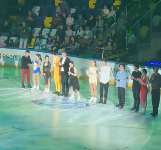 И снова большая компания наших фигуристов демонстрирует свое мастерство широкой публике. Спортсмены прибыли в Монголию, где в Улан-Баторе на Steppe Arena у них запланировано три шоу за два дня. Первое, дневное мероприятие, которое прошло в 3 часа дня по местному времени, уже состоялось и хочется поделиться впечатлениями. В составе нашей спортивной делегации присутствовали: Конечно, это далеко не весь цвет российского фигурного катания, но ребята сумели порадовать и удивить местную публику. Каждый катал по два номера, многие выбрали лучшие постановки из своих коллекций. К примеру у Мориса была "Маска", у Евгении Медведевой ее аутентичный Life, а также Женя выступила с сольным, свежим номером под живой вокал местного певца Amgalan. Сам артист кстати был очень растроган и постановкой в целом и Евгенией в частности: Встречали наших ребят очень тепло: красивые девчонки в национальных костюмах с радостью и благодарностью преподнесли весенние букеты: Ради этого события на Steppe Arena с
