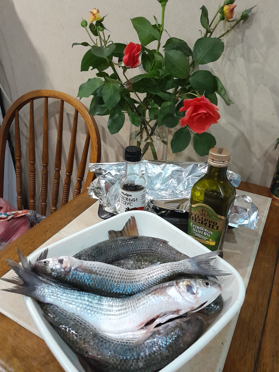 Друзья! Мы сегодня на рынке в пос. Сенной, на побережье Таманского залива поймали вкусную, свежую рыбку, только утром выловленную на Азовском море! Красивая, свежая, с прозрачными глазками и блестящей чешуёй!!!!! Рыбка называется кефаль! Ещё мы купили парочку пеленгасов! Просто шедевр!!!!! Муж её почистил и попорошил. А я её приготовила в духовке. Застелила фольгой форму, добавила оливкового масла, специй, сбрызнула соевым соусом и в духовочку!!!!! Пять штучек потянули на килограмм- всего 300 рублей. В духовку прехали только 4 штучки, а пятую муж посолил! Прошло 25 минут, и я приоткрыла верхюю часть фольги, мамочки, какой аромат!!!! Еще через 5 минут я достала форму, попробовала рыбку, готова, однозначно!!!!! Украсила лимоном! Божечки, какая она вкусная!!!! Недавно, Наташа из Коктебеля (Крым) делилась ценами на рыбку в прибрежном кафе и я тогда возмутилась, 100 грамм- 300 рублей, 3000 рублей килограмм!!!! Просто ужасно! Вот, купили на рынке, сами приготовили, наисвежайшую!!!!! Вкусную