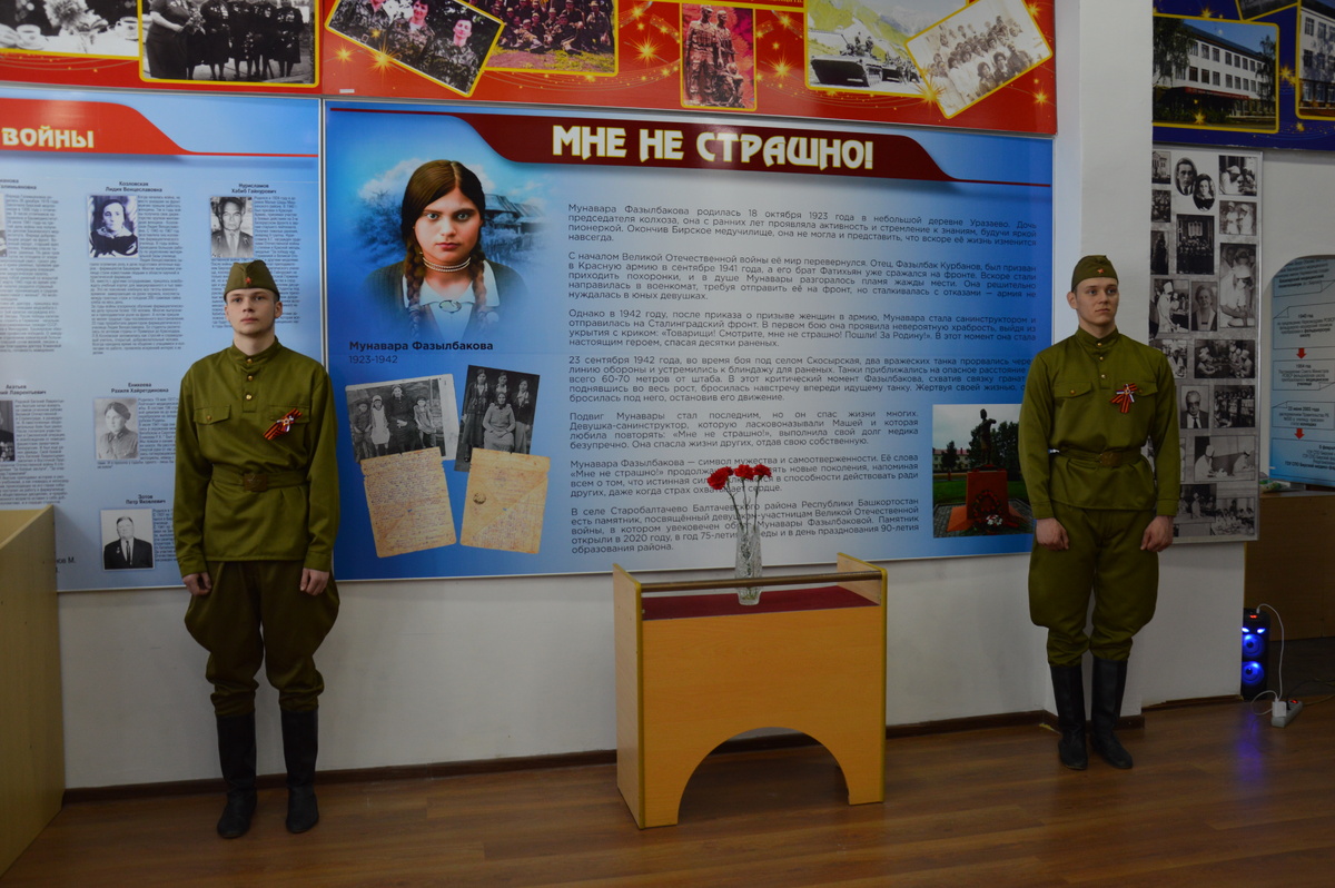 В музее медико-фармацевтического колледжа увековечили героический подвиг выпускницы учебного заведения. Стенд с громким названием «Мне не страшно!» рассказывает о жизни и подвиге Мунавары Фазылбаковой—медсестре и участнице Великой Отечественной войны. Мунавара родом из небольшой деревни Уразаево Балтачевского района. После окончания Бирского медучилища трудилась фельдшером в деревне Шавьяды Балтачевского района. Впереди ее ждала спокойная и счастливая жизнь, но все перевернула война. Отца призвали в Красную армию в сентябре 1941 года, в это время его брат уже вовсю бил фашистов. Вскоре стали приходить похоронки. Мунавара, желая отомстить за своих родных, отправилась в военкомат с просьбой взять ее на фронт, но столкнулась с отказами. Только в 1942 году после приказа о призыве женщин в армию Мунавара становится санинструктором и отправляется на Сталинградский фронт. «Первый бой был страшный. Казалось, рушится все на земле и рушится сама земля под ногами. Как сейчас помню: в эту минуту и
