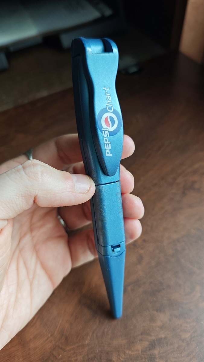 И снова я нахожу у себя в загашниках интересные вещи и делюсь с вами. На сей раз это ручка-радио от пепси. Простенькая, многофункциональная, но в своё время такая желаемая для многих подростков. Историю появления ручки у меня я уже, честно говоря, не помню. То ли собрал необходимое количество крышечек, то ли папа с работы принёс. Но у себя в классе я был первым, у кого она появилась. Писать ей было вполне удобно. Не помню только, можно ли было сменить стержень. Функционал был прост. Под откидной крышечкой находились кнопки включения, перемотки радиостанций и сброса. Выбирать нужную волну, разумеется, было нельзя. О каком бы то ни было экранчике тоже речи не шло. Сзади находился 3, 5 мм разъем для наушников. Как можно видеть, радио работало от двух маленьких круглых батареек. Сейчас, по прошествии большого количества времени, металл окислился и, боюсь, ручка пришла в негодность. Да и видок у нее стал тот ещё потрёпанный. Тем не менее, ностальгические чувства она продолжает вызывать до с