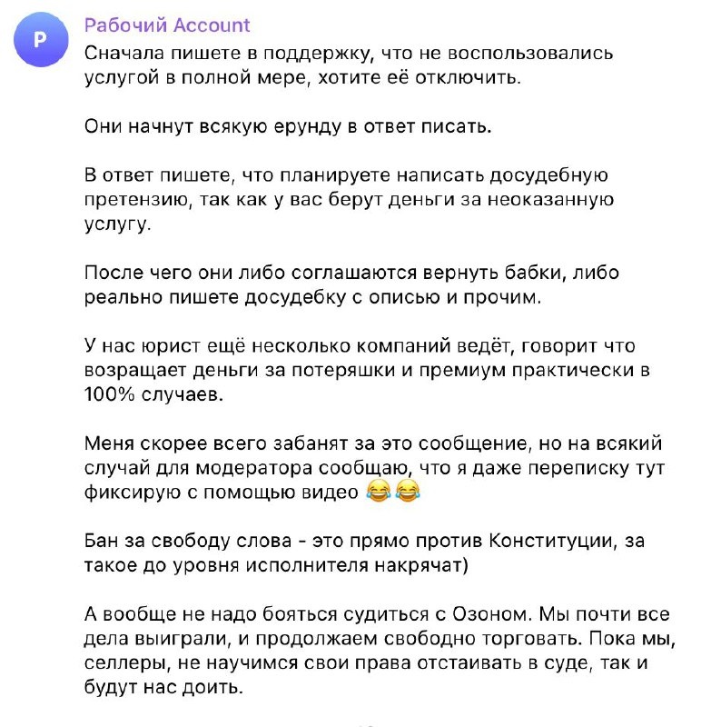 Селлер Ozon дал совет как отстаивать свои права перед маркетплейсом Сначала пишете в поддержку, что не воспользовались услугой в полной мере, хотите её отключить. Они начнут всякую ерунду в ответ писать. В ответ пишете, что планируете написать досудебную претензию, так как у вас берут деньги за неоказанную услугу. После чего они либо соглашаются вернуть бабки, либо реально пишете досудебку с описью и прочим. У нас юрист ещё несколько компаний ведёт, говорит что возращает деньги за потеряшки и премиум практически в 100% случаев. Меня скорее всего забанят за это сообщение, но на всякий случай для модератора сообщаю, что я даже переписку тут фиксирую с помощью видео 😂😂 Бан за свободу слова - это прямо против Конституции, за такое до уровня исполнителя накрячат) А вообще не надо бояться судиться с Озоном. Мы почти все дела выиграли, и продолжаем свободно торговать. Пока мы, селлеры, не научимся свои права отстаивать в суде, так и будут нас доить. Marketplace_biz - отдай свой бус