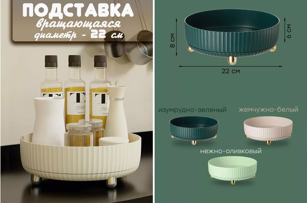 Вращающаяся основа позволяет удобно доставать нужные предметы, не совершая лишних движений. Это особенно удобно при использовании на кухне или в ванной комнате. Высокие бортики гарантируют безопасное хранение ваших вещей.