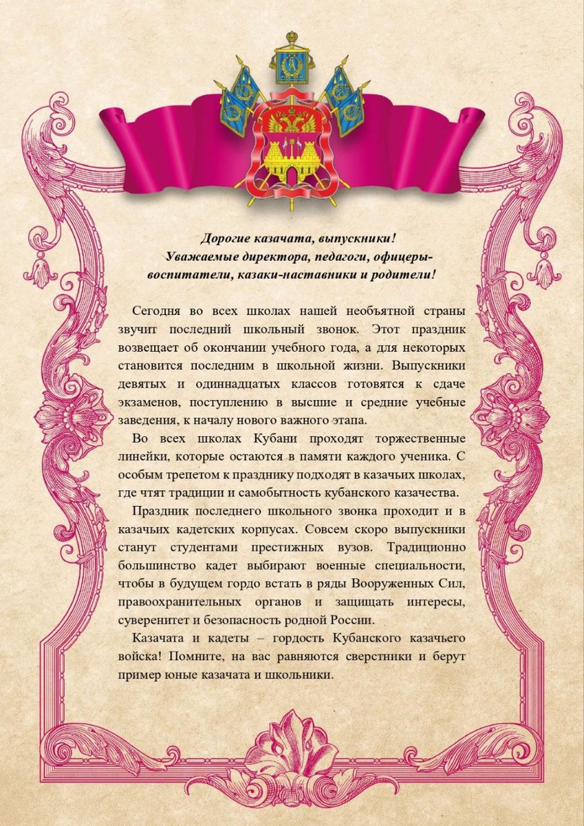 ПОЗДРАВЛЕНИЕ ВОЙСКОВОГО АТАМАНА 🔔Поздравление атамана Кубанского казачьего войска, казачьего генерала Александра Власова с праздником Последнего звонка для кадет казачьих кадетских корпусов учащихся казачьих классов и воспитанников казачьих военно-патриотических казачьих объединений.