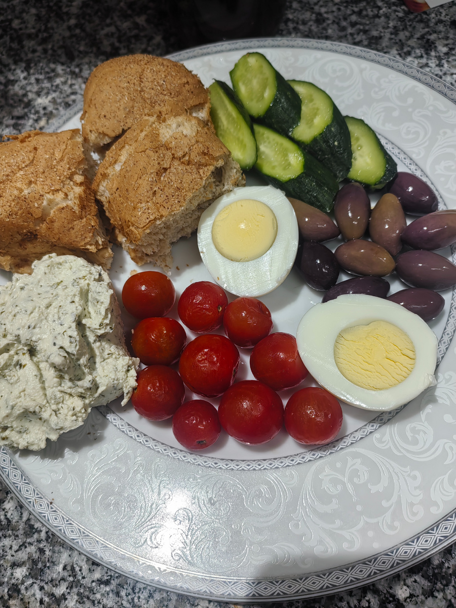 Остатки помидоров черри и творога с травами, булочка с отрубями, греческие оливки, яйцо, огурцы.