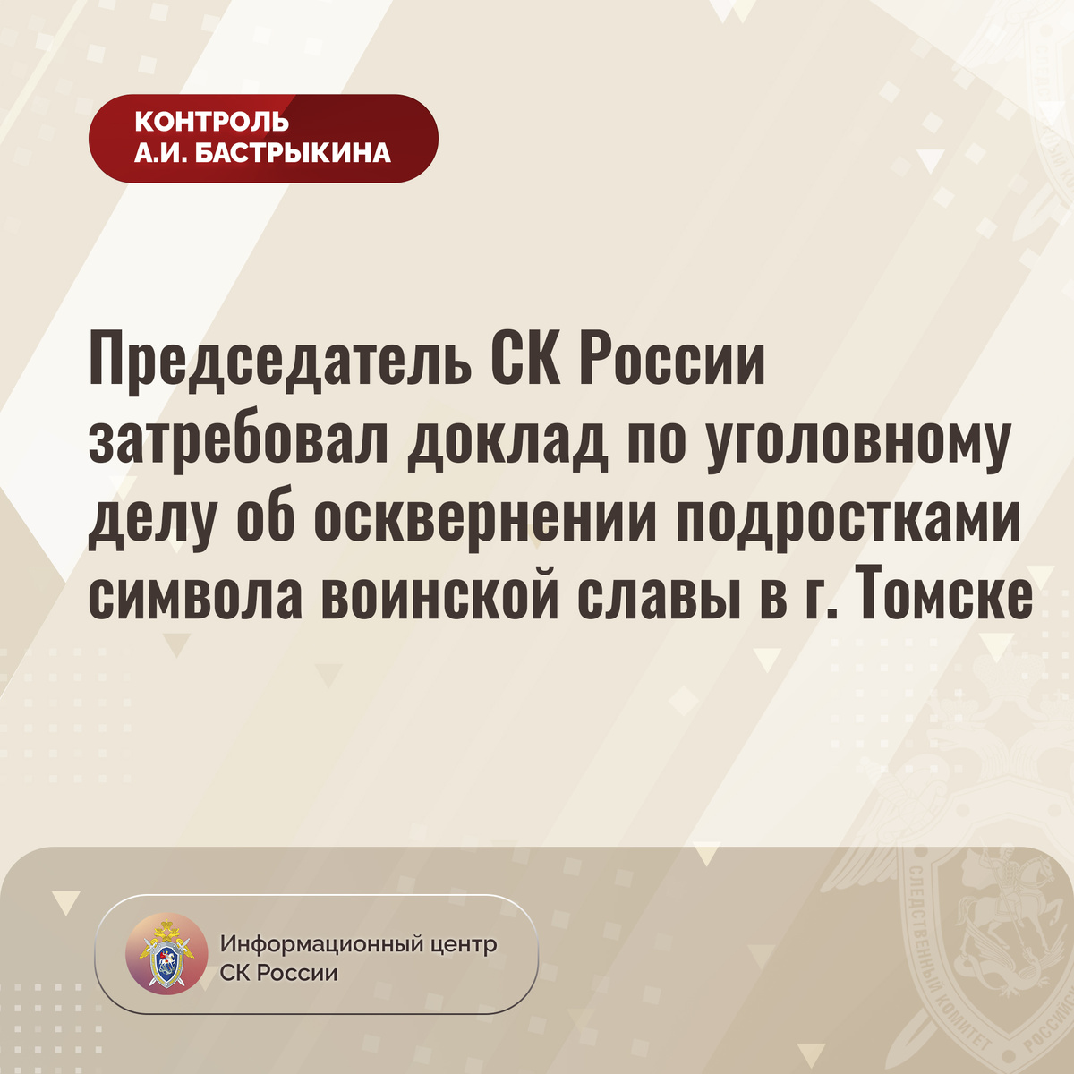 Председатель СК России затребовал доклад по уголовному делу об осквернении подростками символа воинской славы в г. Томске В СУ СК России по Томской области расследуется уголовное дело, возбужденное по признакам преступления, предусмотренного ст. 354.1 УК РФ (реабилитация нацизма). По данным следствия, в мае текущего года в городе Томске двое 17-летних подростков подожгли Знамя Победы, фиксируя свои действия на камеру мобильного телефона. Указанная ситуация освещается в СМИ. Председатель Следственного комитета Российской Федерации Александр Иванович Бастрыкин затребовал у и.о. руководителя СУ СК России по Томской области Святослава Вячеславовича Горячева доклад о ходе и результатах расследования уголовного дела. Исполнение поручения поставлено на контроль в центральном аппарате ведомства. #СледственныйКомитет #СКРоссии #СКР #ИЦСКР #ИнформационныйЦентр #АлександрБастрыкин #ПредседательСКР #КонтрольПредседателяСКР #КомментарийКонтроль #ТомскаяОбласть