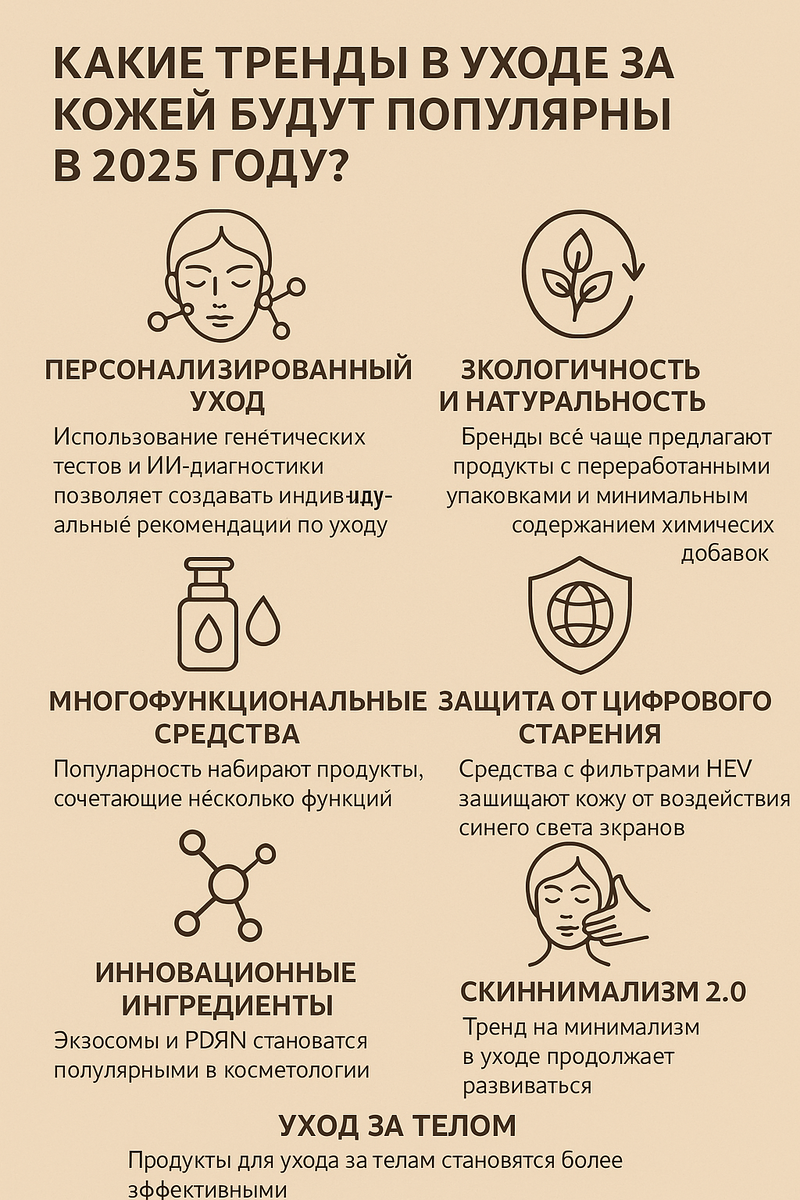 Уход за кожей постоянно развивается, и каждый год появляются новые продукты и методы. В 2025 году можно ожидать рост популярности нескольких ключевых трендов. Ожидается, что в 2025 году будут активно развиваться устройства для домашнего использования, которые будут сочетать в себе технологии и косметику, например, устройства для массажа лица, ультразвуковые очистители или приборы для нанесения кремов. Пример: В продаже появятся устройства для очищения кожи с функциями массажа и тонкой настройки под нужды конкретной кожи. В 2025 году будет продолжаться тренд на антивозрастные процедуры, особенно те, которые используют новые научные разработки, такие как генетический анализ для персонализированного ухода. Пример: Салоны красоты начнут предлагать услуги по персонализированному уходу, основанные на генетических тестах, которые помогут подобрать наиболее эффективные средства. С каждым годом растет спрос на экологичную косметику, которая использует натуральные компоненты, а также на процедур