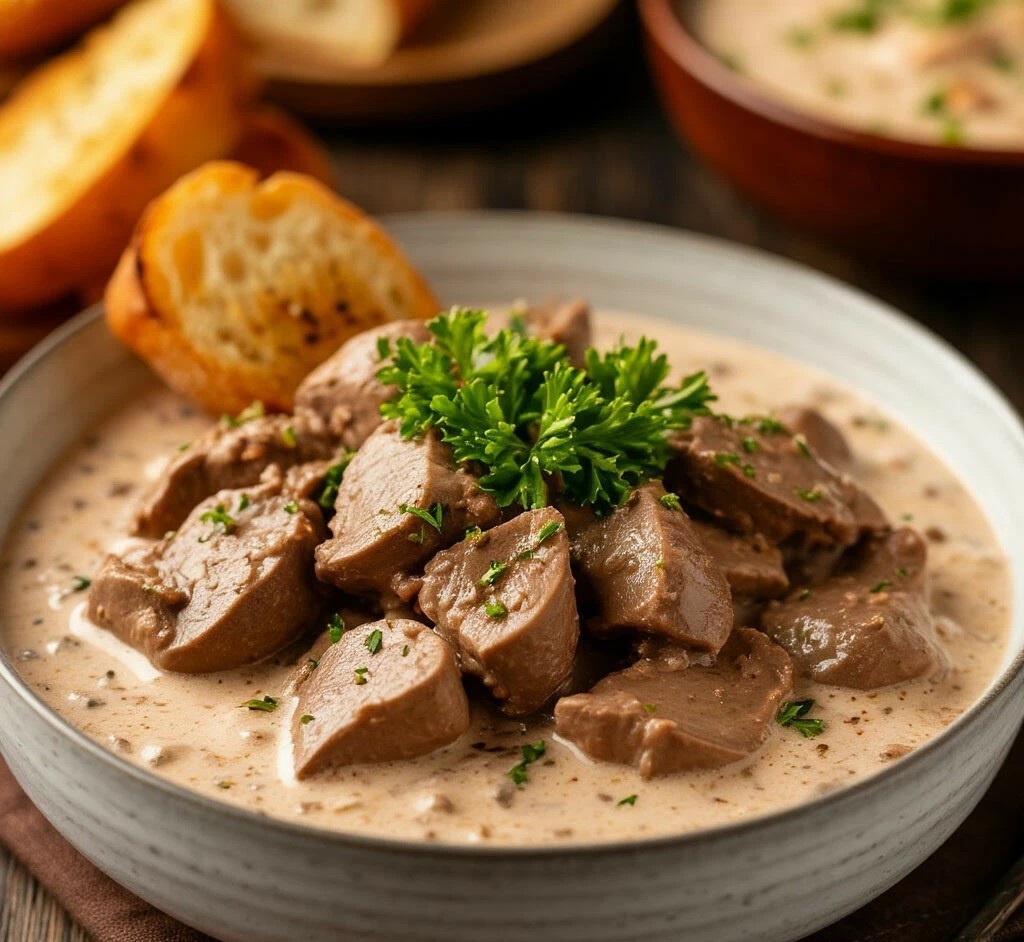 Ингредиенты: - 500 г куриной печени - 1 средняя луковица - 200 мл сливок - 30 г сливочного масла - соль и перец по вкусу Приготовление: 1. Печень промойте и обсушите бумажным полотенцем. 2. Лук очистите и нарежьте тонкими полукольцами. 3. В сковороде растопите сливочное масло и обжарьте лук на среднем огне до золотистого цвета. 4. Добавьте печень к луку, посолите и поперчите по вкусу. Обжаривайте на среднем огне, периодически помешивая, до тех пор, пока печень не станет золотистой. 5. Влейте сливки и перемешайте, чтобы они покрыли всю печень. Тушите на среднем огне еще 5-7 минут, пока сливки не загустеют. 6. Подавайте печень со сливочным соусом и гарниром по вкусу, например, с картофельным пюре или рисом. Приятного аппетита!
