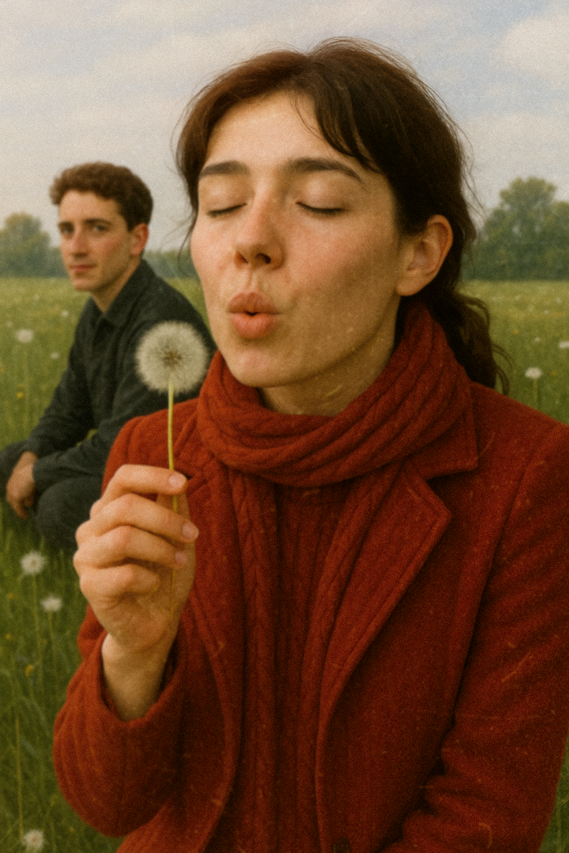Летящие пушинки ловят свет, как маленькие фонарики. Трава — не зелёная, а будто из воспоминаний, тёплая. Небо — мягкое, как акварель. И в центре — она, с желанием на губах. Не просьба, не каприз, а тёплая уверенность: всё будет