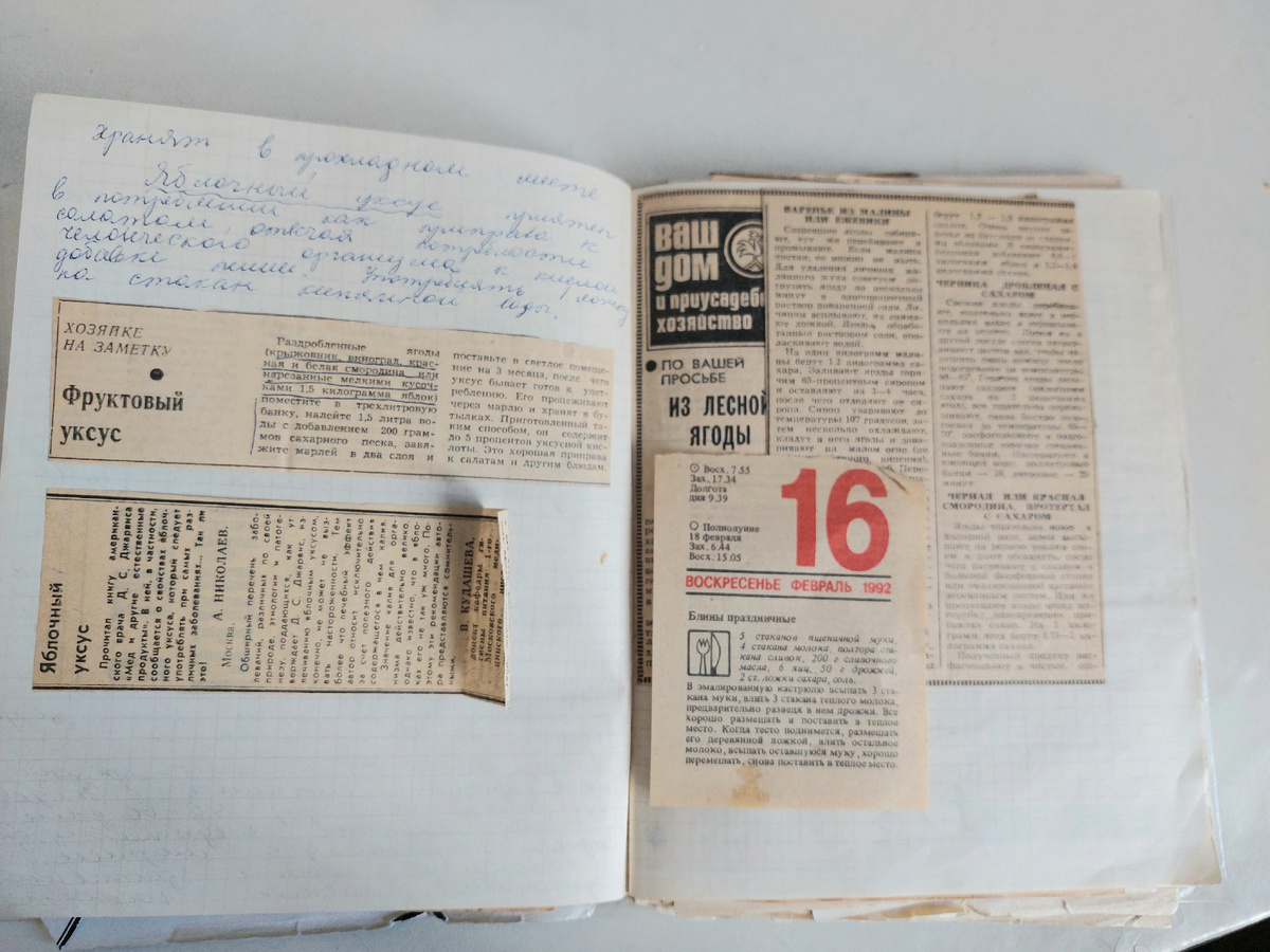 Здравствуйте, дорогие читатели. На моем канале я показывала винтажные вещи, купленные на барахолке и вещи, найденные на мусорке. Но винтажными могут быть не только вещи, но и кулинарные рецепты. На мусорке, среди книг, была найдена старая тетрадь с пожелтевшими страницами с кулинарными рецептами. Судя по календарным листочкам , неизвестная женщина собирала рецепты в 90-е годы. Я хочу поделиться с Вами этими рецептами. В годы СССР не было такого, как сейчас, изобилия продуктов, поэтому все рецепты из доступных продуктов. На канале будет отдельная рубрика по кулинарии. Сегодня я перепишу из этой тетради два рецепта - салатик весенний, лёгкий в приготовлении и тортик. На некоторые рецепты нет названий и я буду придумывать их сама. Салат "ДЕШЕВЛЕ НЕКУДА" Для салата понадобятся: Квашеная капуста + свёкла +лук +лимон. Количество не указано, так что Вам в помощь Ваше чутьё! Капусту промыть, мелко нарезать и заправить по вкусу растительным маслом, солью и сахаром. Свёклу мелко порезать и не