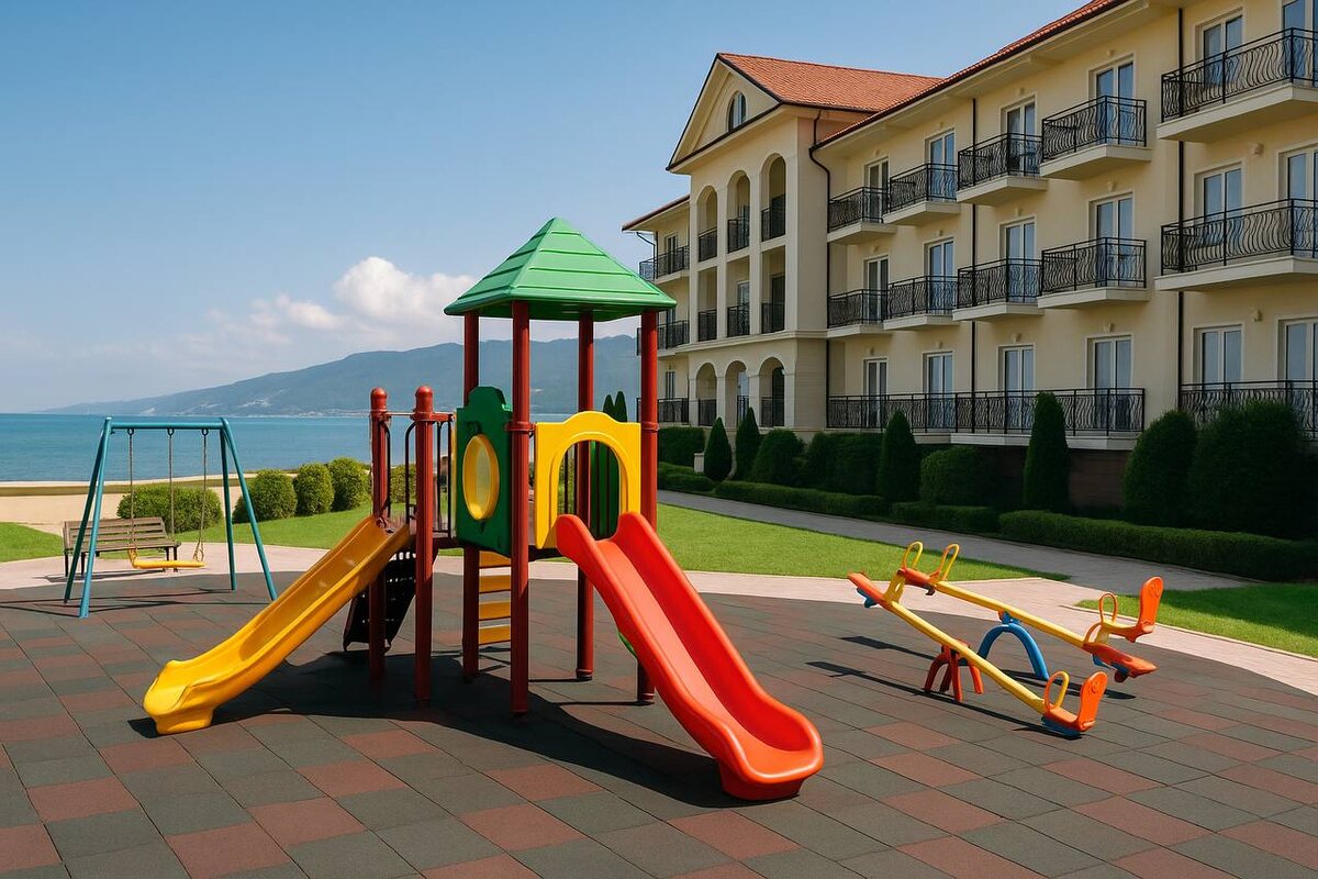• Парк-отель «Лазурный берег»: предлагает детские бассейны с водными горками, игровые площадки и анимационные программы.