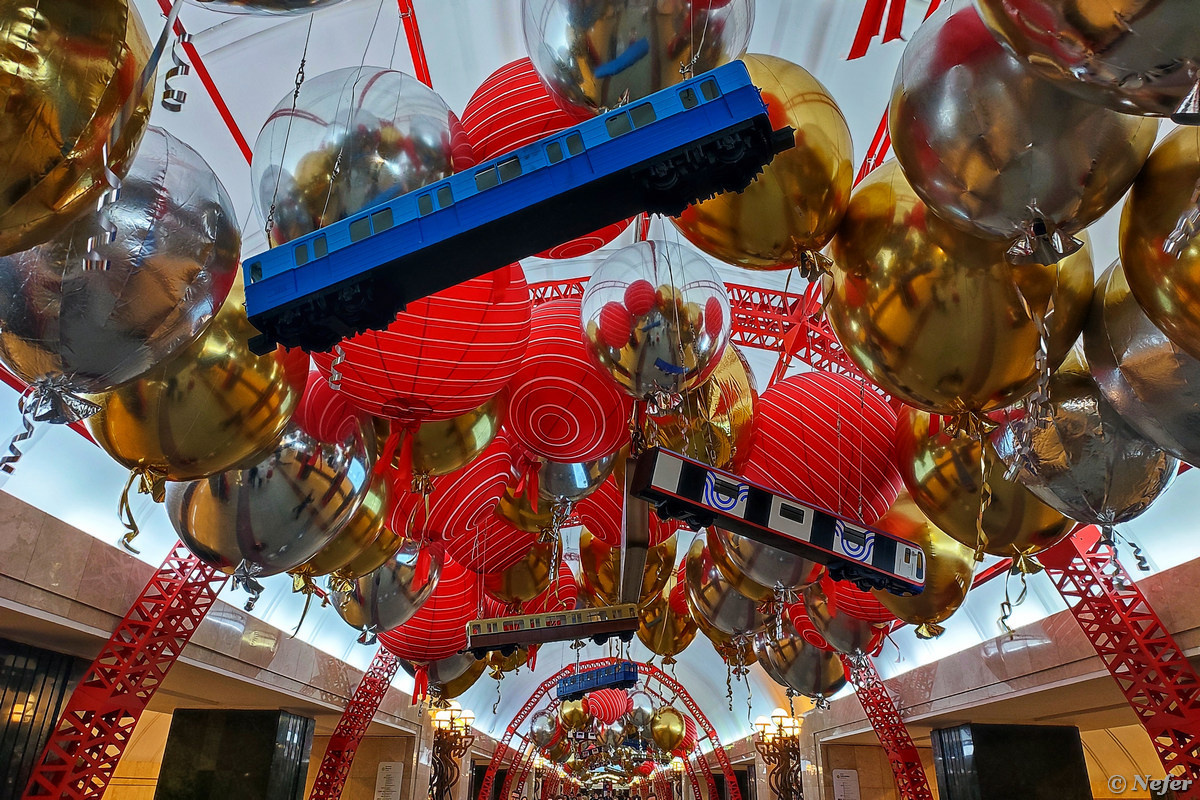 К 90-летию московского метро станцию Трубная украсили воздушными шарами и моделями поездов