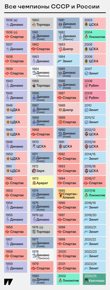 Вошли в компанию. «Краснодар» впервые стал чемпионом России! Новый победитель в чемпионатах СССР и России. Клубу всего 17 лет – и вот долгожданный трофей. Вот все чемпионы в истории нашего футбола. ⭐️ В 1936-м «Динамо» стало первым чемпионом СССР: выиграли все шесть матчей весеннего первенства. А в 1937-м динамовцы первыми в советском футболе сделали золотой дубль: чемпионат и Кубок СССР. ⭐️ «Спартак» – самый титулованный клуб в объединенном рейтинге. 12 раз брали чемпионат СССР, еще 10 чемпионств – в российской истории. Правда, последнее золото осталось еще в 2017-м. ⭐️ Чемпион не из Москвы или Петербурга – впервые с 2009-го. Тогда дважды подряд выиграл казанский «Рубин», теперь сверкнул «Краснодар». В российской истории первым нестоличным чемпионом была тоже южная «Алания» из Владикавказа, и вот теперь титул тоже там неподалеку. ⭐️ «Краснодар» выиграл РПЛ после шести чемпионств «Зенита» подряд. Остановили гегемона и сами наконец забрали трофей. Поздравляем нового чемпиона! Мусаев все
