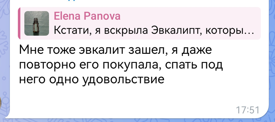 Однажды сидела я дома за рабочим столом, работу работала. И захотелось мне чего-то новенького запустить в диффузор. Открыла свои запасы эфирных масел и увидела, что у меня есть абсолютно новый, не вскрытый флакон эфирного масла Эвкалипта от doTERRA. Его я получила в подарок от компании за очередной заказ. Поясню – каждый месяц компания дарит за заказ от определенной суммы какой-то продукт. Так вот, я решила, что протестирую его. Аромат, кстати, оказался очень приятным! Время было дневное, примерно 16:00. Через пару часов распыления эфирного масла Эвкалипта в диффузоре-увлажнителей воздуха, я вдруг начала зевать и безумно хотеть спать. Удивилась – время же еще детское. Решила поделиться своими впечатлениями от аромата эфирного масла Эвкалипта в нашем чате Велнес-Консультантов doTERRA, что мол аромат приятный, рекомендую. И вдруг одна девушка мне отвечает: «Мне тоже Эвкалипт зашел, спать под него одно удовольствие». Спать?! Ах, вон оно что! Вот почему спустя пару часов аромата Эвкалипт