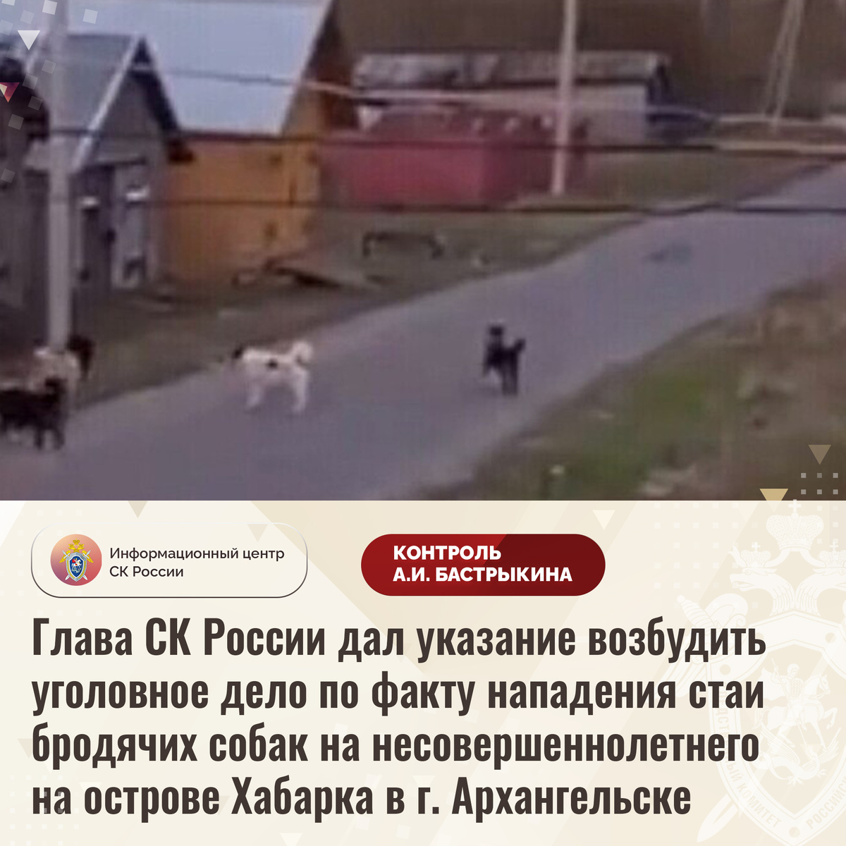 Глава СК России дал указание возбудить уголовное дело по факту нападения стаи бродячих собак на несовершеннолетнего на острове Хабарка в г. Архангельске В СМИ сообщается, что в мае текущего года на острове Хабарка в городе Архангельске агрессивные животные набросились на 16-летнего подростка, укусив его за руку и лицо. Пострадавшему потребовалась медицинская помощь. Отмечается, что в населенном пункте обитает большое количество бездомных собак, однако меры к организации их отлова не принимаются. В СУ СК России по Архангельской области и Ненецкому автономному округу по данному факту организована процессуальная проверка. Председатель Следственного комитета Российской Федерации Александр Иванович Бастрыкин дал указание руководителю СУ СК России по Архангельской области и Ненецкому автономному округу Алексею Валерьевичу Попову возбудить уголовное дело и представить доклад об установленных в ходе первоначальных следственных действий обстоятельствах, а по завершении расследования уголовного