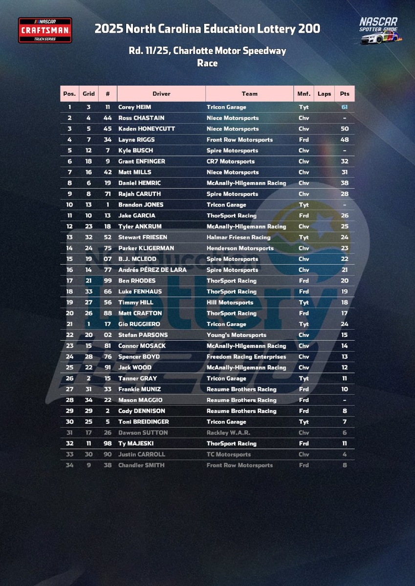 Кори Хайм в очередной раз доказал всем, что в пикапах ему больше делать нечего – тотальная доминация по ходу всего заезда, два выигранных стейджа, лучший круг и победа в гонке, которые суммарно приносят максимально возможные 61 очко. Навязать борьбу Хайму не смогли пилоты Niece – более чем в шести секундах позади Кори финишировал Росс Честейн, третьим стал Кэйден Ханикатт. Пятёрку дополнили Лэйн Риггс и Кайл Буш.