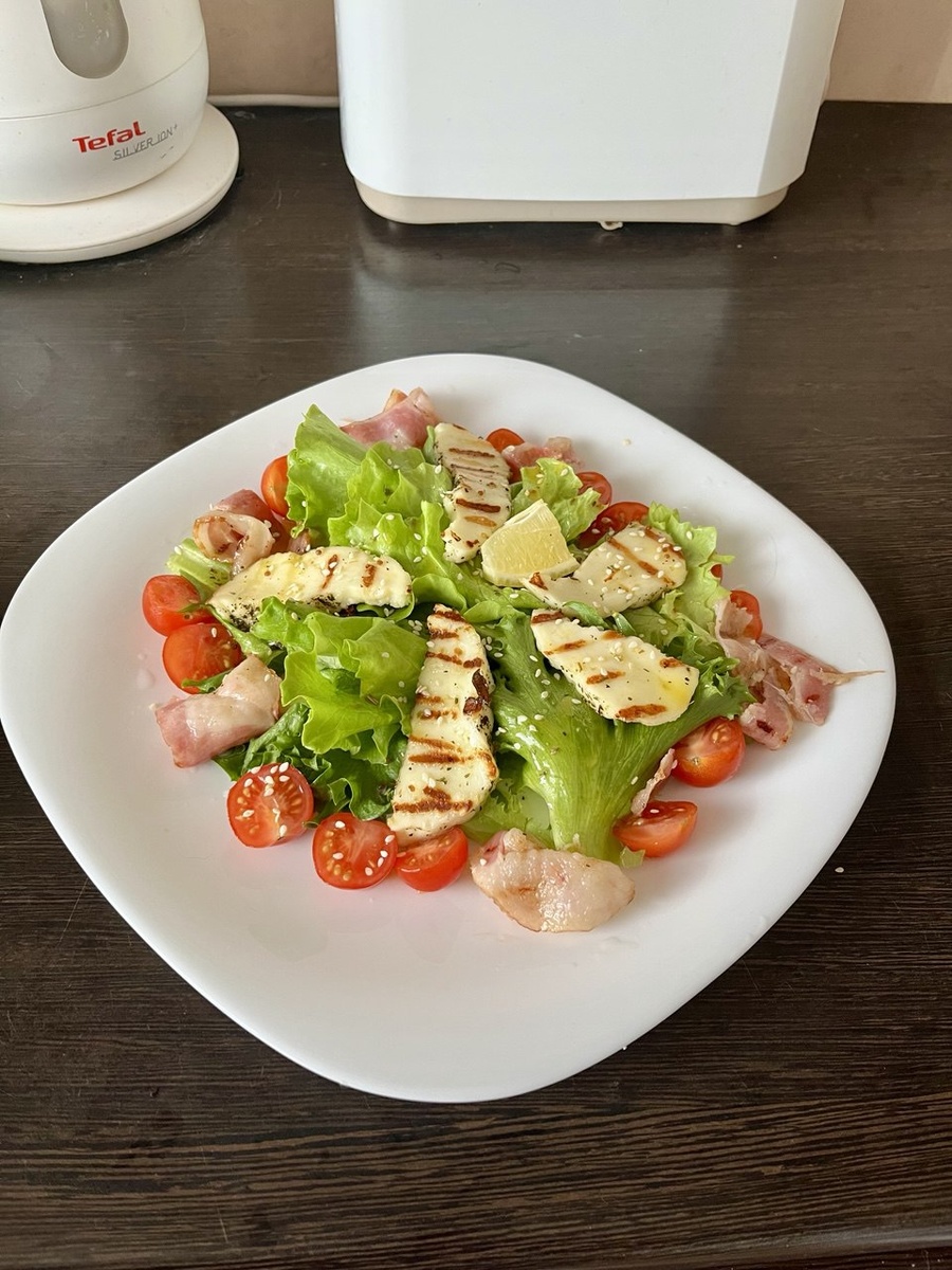Всем добрым людям! Я сегодня снова с кулинарным контентом. Как вы помните, ко мне в гости приехала сестра с младшим сыном. Сегодня угощала Ирину салатом с беконом и халуми. Для тех, кто не знает, халуми - это такой сыр для жарки. Я, например, про такой сыр знала, так как все таки в пищевой отрасли работаю. Но сама купила первый раз. Повар, который мне дал этот рецепт, настоятельно советовал покупать халуми во Вкусвилле, остальные ему не так нравятся. Я все же купила дешевле, нашего местного производителя. Сестре очень понравился салат, сказала, что обязательно возьмёт в свою копилку. Действительно, сочетание хрустящего бекона, нежной зелени и пикантного сыра халуми даёт просто потрясающий вкус. И очень интересный соус получился. Вообще, с дижонской горчицей все вкусно. Надо попробовать ещё такой же соус приготовить, но с французской. Итак, делюсь рецептом. Все ингредиенты на одну порцию. 🔸 Бекон - 2-3 слайса 🔸 Листья салата 🔸 Халуми - 4-5 долек 🔸 Черри - 6 шт. 🔸 Семечк