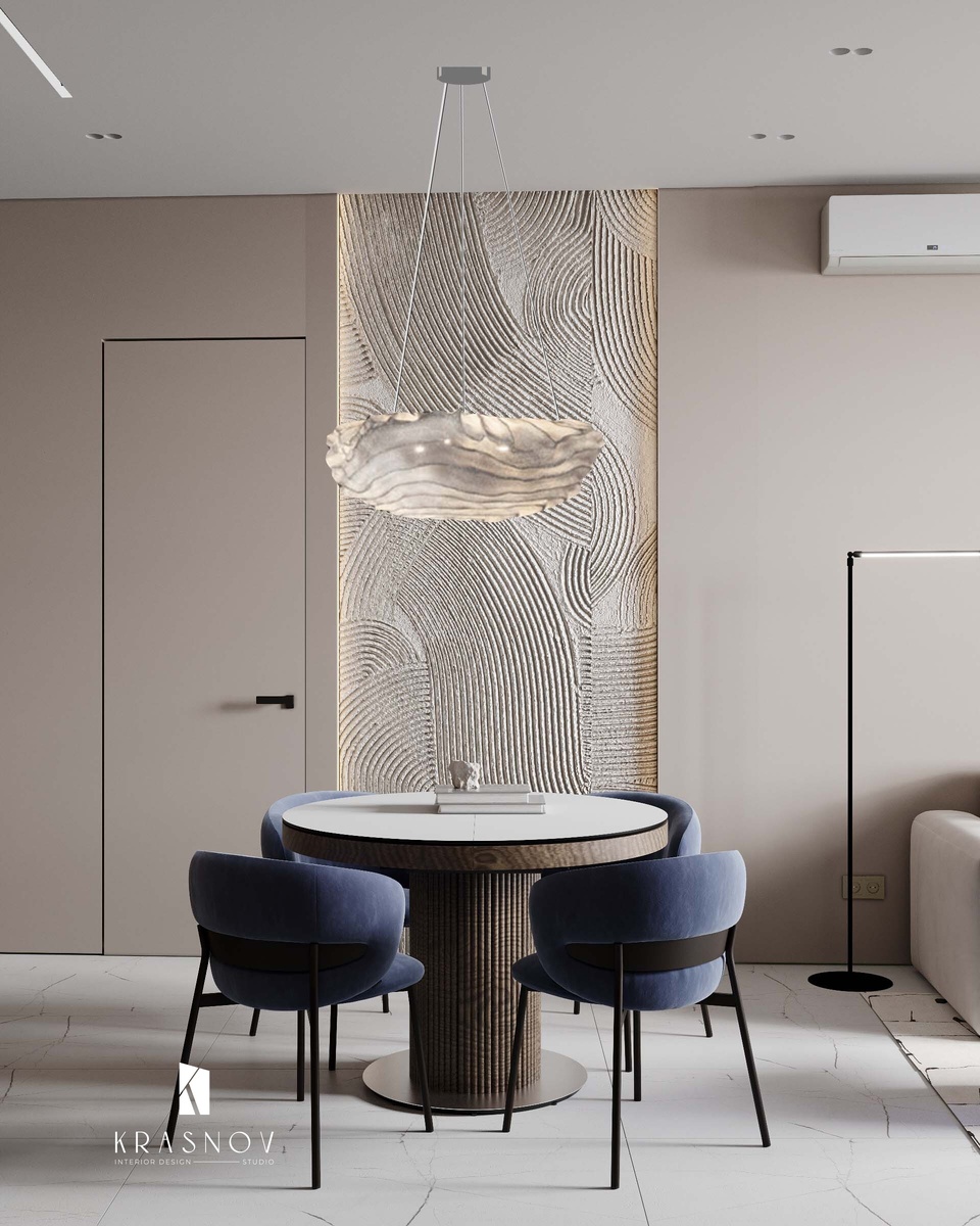 Объединённая кухня-гостиная в этом проекте — не просто тренд, а осознанное архитектурное решение. Мы стремились не к открытости ради визуального «вау», а к сцене для жизни — спокойной, цельной, логичной. Здесь нет резких переходов между зонами. Всё выстроено как единое целое — чтобы интерьер не дробился, а «дышал» и поддерживал повседневный ритм. Основу пространства задают фактуры: дерево с естественной текстурой, матовые фасады, гипсовые панели. Они создают ту самую комбинацию — визуальное спокойствие и осязаемую глубину. Интерьер не кричит о себе, но остаётся выразительным. Свет здесь — мягкий, распределённый. Его задача — не отвлекать, а подчёркивать архитектуру. В центре композиции — живой огонь биокамина. Это не декоративный элемент, а смысловой центр. Он задаёт ощущение уюта и «домашности», особенно в вечерние часы. Панели с рельефом не играют роль «декора». Они работают на ритм — визуальный и пространственный. Придают помещению тактильность и динамику. Это важная деталь, особенн