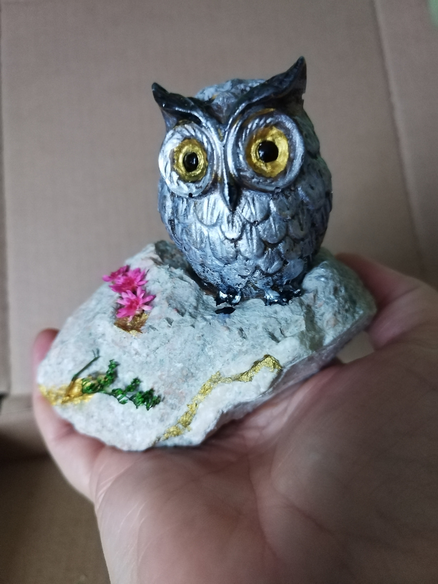 Вот такая совушка у меня получилась! Для того чтобы создать это чудо я залила эпоксидную смолу в молд. Две части смолы и часть отвердителя (отвердителя всегда делаю на капельку больше) , ещё три капли бронзового перламутра для смолы. Всё тщательно перемешиваем в течении пяти минут На прогулке с дочей подобрали камень , я придумала на него посадить совушку. В детстве мы с братом в лесу нашли совёнка со сломанным крылом , вот прямо такого же с золотистыми глазами, мы кормили его мелко нарезанным мясом и очень его полюбили , но он погиб , видимо не смог жить в неволе. Наревелись мы тогда... На камень нанесла линии золотым акрилом и приклеила веточку с цветами , мне хочется чтобы моя сова как-бы сидела на скале . Сначала я акрилом окрасила её в золотисто-коричневый , но потом я её всё-таки сделала полярной (почти белой) , а вам какой вариант больше нравится? Поделка мне очень понравилась , дочь утащила её к себе на полочку , похоже на ярмарку придётся делать другую , что ж , пойду ис