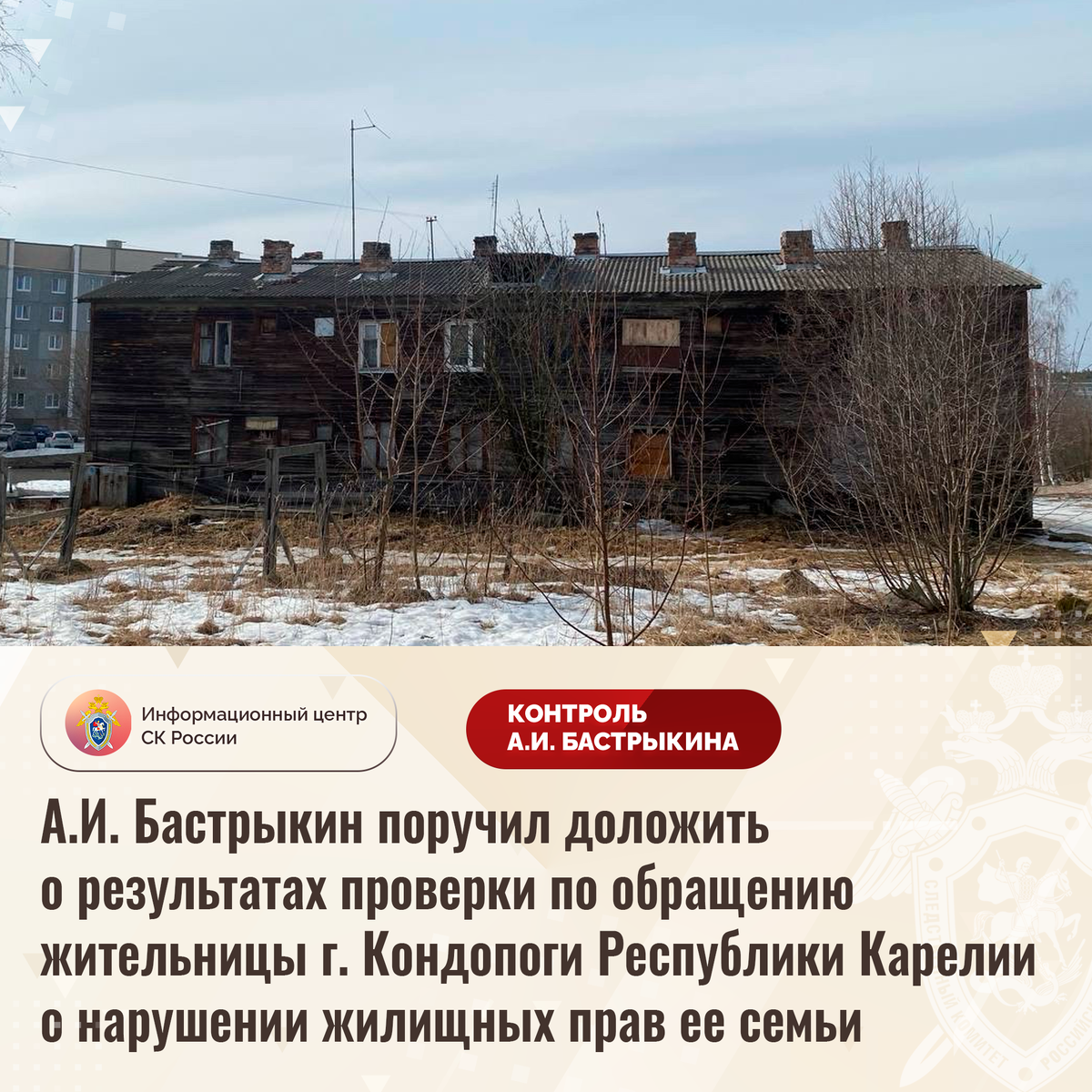 А.И. Бастрыкин поручил доложить о результатах проверки по обращению жительницы г. Кондопоги Республики Карелии о нарушении жилищных прав ее семьи В приемную Председателя СК России А.И. Бастрыкина «ВКонтакте» обратилась жительница города Кондопога Республики Карелии по вопросу длительного нерасселения многоквартирного дома по улице Парковой. Семья заявительницы является единственными жильцами здания, 1953 года постройки, признанного аварийным в 2017 году из-за разрушающихся несущих конструкций и фундамента, протечек кровли и отсутствия систем водоснабжения и водоотведения. Однако обращения в администрацию с просьбой предоставить им благоустроенное жилое помещение результатов не принесли, сроки расселения перенесены с 2025 на 2030 год. В СУ СК России по Республике Карелии по поступившему обращению организована процессуальная проверка. Председатель Следственного комитета Российской Федерации Александр Иванович Бастрыкин поручил руководителю СУ СК России по Республике Карелии Евгению Никол