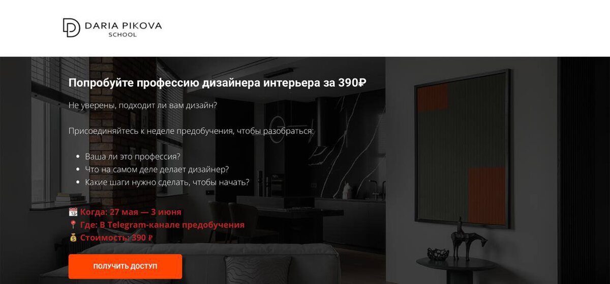 ДА, это та самая возможность, которую я решила предоставить. Без риска и без покупки всего курса❗️ Я вижу, как многие сомневаются, поскольку не понимают, что на самом деле делает дизайнер интерьера🤔 Отсюда и непонимание, точно ли эта сфера для вас или это временная хотелка, которая пройдёт через месяц... Чтобы разобраться, я решила открыть доступ к модулю «ПРЕДОБУЧЕНИЕ» из моего курса «Дизайнер интерьера — профессия мечты» с 27 мая по 3 июня 📍Что даст вам неделя предобучения? ⋅ Вы поймёте, чем реально занимается дизайнер интерьера — без прикрас, мифов и глянцевой картинки из Pinterest ⋅ Получите чёткое представление о профессии — её задачах, функциях, процессе и целях ⋅ Узнаете, что нужно рынку и как строится карьера: от первых заказов до собственных студий ⋅ Разберётесь, какие компетенции нужны, и с чего начать прокачку, даже если у вас нет опыта ⋅ Познакомитесь с реальными инструментами работы — ArchiCAD, Photoshop, визуализация, мудборды ⋅ Сформируете собственную точку зрения: сто