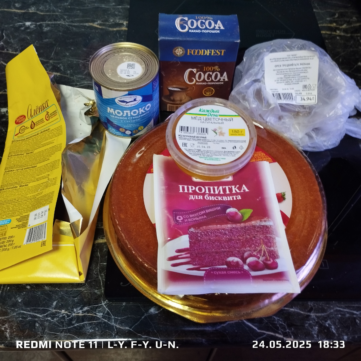 Зафигачим сегодня торт транформер Куплены коржи, пропитка для бисквита вишневая с коньяком. Стало интересно что за фигня такая? Оказалось просто химия какая то, придает вкус. Заливается кипятком. Что то наподобие инвайта или юпи. Просто разбавь водой порошок и получается вишнево коньячный вкус. Промазываю бисквитные коржи этой пропиткой. Отрываю сгущенку и смешиваю её с какао, заливаю сверху. Натираю на тёрке шоколад сверху и грецкий орех, и заливаю сгущёнкой для эстетики цвета и ставлю в холодильник. Получился быстро приготовленный "космический корабль" противника состоящий из составных модулей, Время приготовления примерно половина часа, потому что нужно было чуток подождать чтоб пропитка немного остыла. При поедании был выявлен очень сладкий вкус, видимо пропитка содержала много сахара. Перебор по сладости это плохо, нужно было добавить кислотности, лимон в одну из прослоек например добавить. Учту на будущее, готовые бисквитные коржи интересная тема. Купил крем " взбитые сливки"