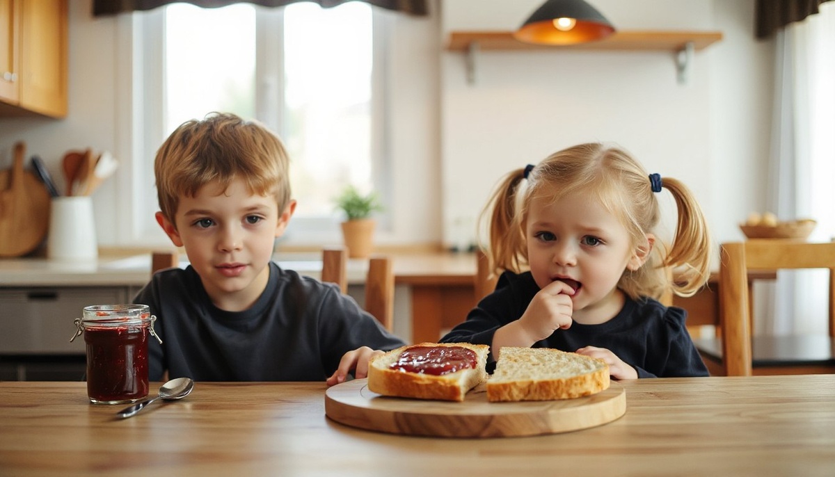 Миша, наш шестилетка, деловито рассказывал о предстоящем утреннике в детском саду, а трехлетняя Алиса старательно пыталась намазать джем на тост, высунув от усердия кончик языка.
