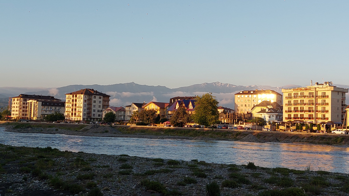 Если вы вышли на вечернюю прогулку в Адлере, то рекомендую прогуляться по Набережной реки Мзымта. У меня на канале есть отдельная статья про эту набережную. Именно на фоне заката здесь открываются прекрасные виды на горы.