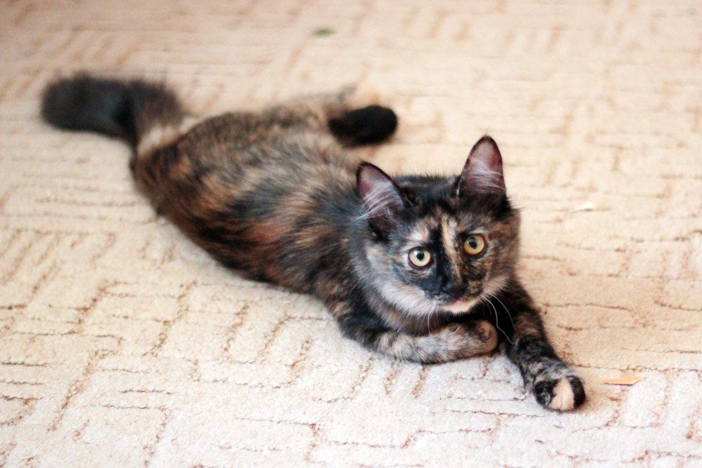 С Тришей я познакомилась задолго до того как стала ее хозяйкой. Однажды я пришла к своей подруге Наде и обнаружила что та подобрала маленького котенка в подъезде. Подруга ее выходила, стерилизовала и Триша выросла в игривую милую кошечку, которая стала моей подруге верным другом. При первом знакомстве Триша пыталась со мной играть, точнее с моими ногами в капроновых колготках и тут же поставила мне затяжку и пару царапин)) Надя поспешила мне дать йод для обработки царапин, но этот казус меня скорее развеселил, чем расстроил. Триша тогда была подростком, а кошки в этом возрасте все очень игривые.