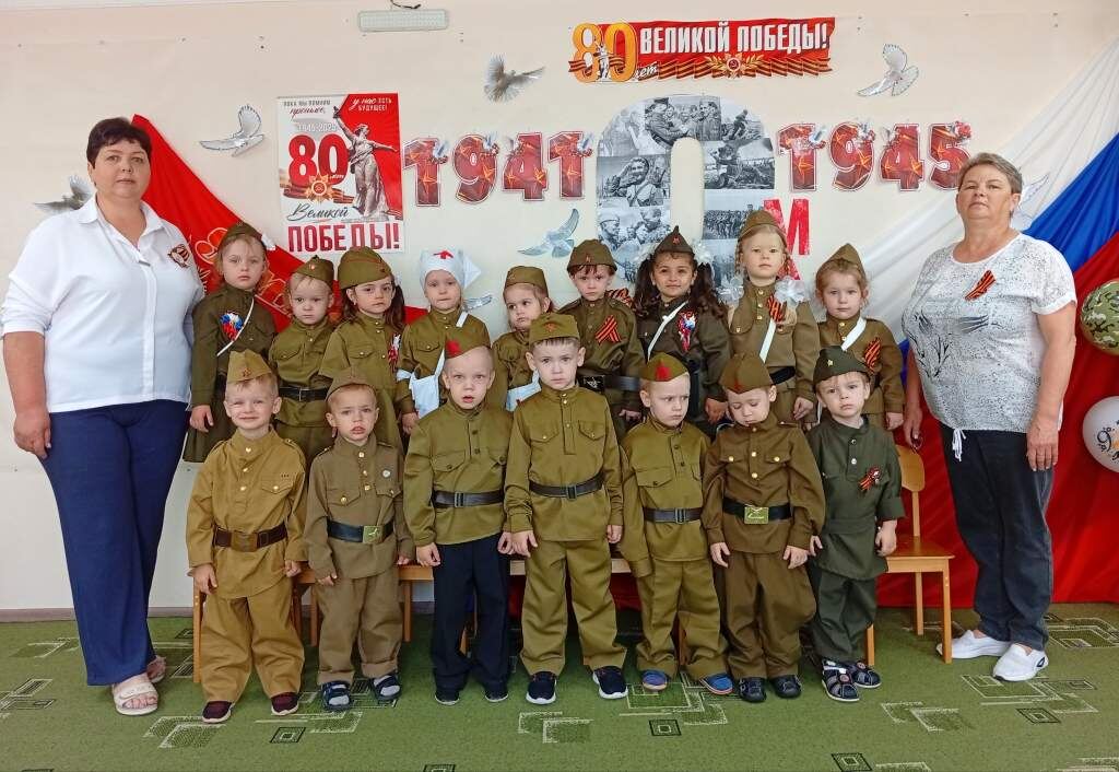 Нет в России семьи, которую война обошла стороной В День Победы в каждой семье вспоминают тех, кто остался на полях сражений и поздравляют ветеранов Великой Отечественной войны, которые защищали Родину. Этот праздник — символ мужества, силы духа и единения народа. В детском саду «Золотой ключик» педагоги стремятся привить воспитанникам гордость за Отечество, народ, родных и близких. Ведь их прадеды внесли неоценимый вклад в общую Победу. Ребятам рассказывают о том, какой ценой советский народ одержал Победу в Великой Отечественной войне. К 80-летию Победы родители воспитанников поддержали акцию #ОкнаПобеды#, совместно с детьми подготовили рисунки на военную тему для выставки. На празднике в честь Дня Победы ребята пели песни, читали стихи, участвовали в соревнованиях. А в конце мероприятия был праздничный салют в виде танца с разноцветными лентами. Пусть дети еще малы, не совсем понимают слова «захватчики», «фашисты», «сражение», «тыл», но скоро они вырастут и узнают о великом подвиге