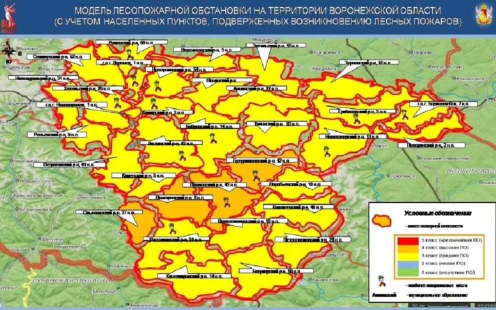 В четырех районах Воронежской области установили IV класс пожарной опасности. Соответствующая информация появилась в оперативном прогнозе возникновения и развития чрезвычайных ситуаций регионального ГУ МЧС России в субботу, 24 мая. Согласно перечня, высокую степень пожарной опасности объявили в Бутурлиновском, Ольховатском, Павловском и Подгоренском районах. При этом на территории 30 муниципалитетов сохраняется III (средний) класс пожарной опасности. К ним относятся, Аннинский, Бобровский, Богучарский, Верхнемамонский, Верхнехавский, Воробьевский, Грибановский, , Калачеевский, Каменский, Кантемировский, Каширский, Лискинский, Нижнедевицкий, Новоусманский, Новохоперский, Острогожский, Панинский, Петропавловский, Поворинский, Рамонский, Репьевский, Россошанский, Семилукский, Таловский, Терновский, Хохольский и Эртильский районы. А также Борисоглебский городской округ, Воронеж и Нововоронеж.