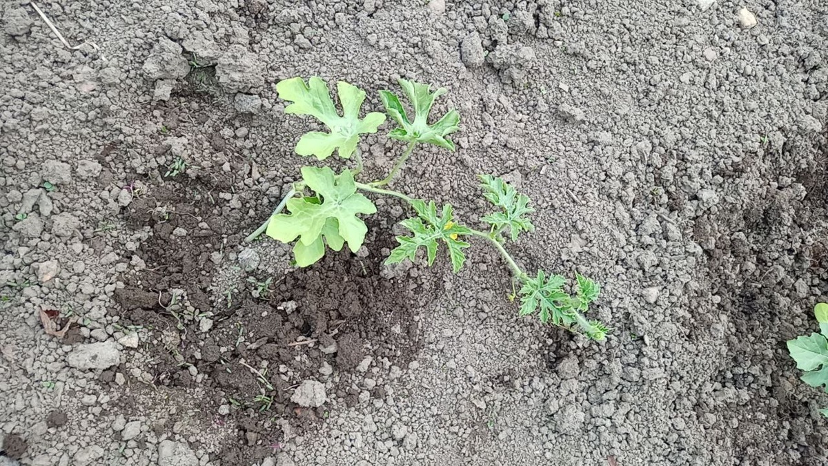 Итак, прошло полтора месяца, как мы посадили семечки арбуза сорта Огонек на рассаду (можно прочитать здесь). Весна выдалась крайне холодной и дождливой. В доме рассада стала тянуться, и пришлось ее вынести в теплицу. Эту статью пишу через неделю после высадки рассады в парник. Прежде хочу отметить, что очень дружно взошли семена, из посаженных семечек вышли все в одно время, то есть всхожесть 100%. Вот такой была рассада всего через 7 дней после посадки. Но, как я сказал, температура была очень холодной, и даже в теплице рассада страдала и ослабла, ночью температура опускалась до 3 градусов в теплице. Из пяти саженцев явно заболели три и стали отставать в росте. Вот так выглядят заболевшие саженцы после высадки в грунт. Прошло около пяти дней и с наступлением тепла вроде начинает оживать, идет вполне здоровый лист. Но некоторым холод был нипочем и выглядят они вполне достойно. Глядя на холодную весну, решил без укрытия арбузы вообще не сажать, а высадил в парник. Это еще хорошо тем, чт