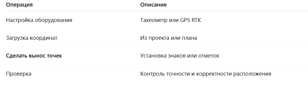 Вынос точек в натуру — одна из самых востребованных геодезических услуг в Москве и Московской области. Без неё невозможно точно установить границы участка, начать строительство или правильно разместить объекты на местности. В этой статье рассмотрим, из каких этапов состоит процедура, кто её выполняет и сколько стоит услуга выноса точек. Вынос точек — это геодезическая процедура, в ходе которой координаты, указанные в проектной или кадастровой документации, переносятся на местность. На практике это означает, что инженер делает вынос точек, устанавливая в нужных местах колышки, маяки, краску или реперы. 🧭 Это ключевой этап при: Работы проводит инженер-геодезист, имеющий: ⚠️ Самостоятельно выполнить точный вынос невозможно — ошибки приведут к переделке фундамента, штрафам и спорам с соседями. Инженер запрашивает или получает координаты из: Если координаты отсутствуют — их можно заказать в составе инженерно-геодезических изысканий. Клиент обеспечивает: По завершению работ составляется ак