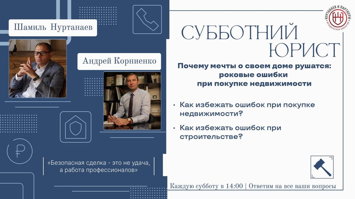 🔴🔴🔴🔴🔴 Почему мечты о своем доме рушатся: роковые ошибки при покупке недвижимости Сегодня 24 мая в 14:00 вы узнаете ответ на этот и на многие другие вопросы на трансляции "Субботнего Юриста" ⚖️ Эфир проведет юрист с более, чем 20 летней практикой – Шамиль Нуртанаев (нажав на имя вы можете узнать о юристе больше), а также Гость эфира — Андрей Викторович Корниенко, судебный эксперт в области строительства и землепользования. Тема эфира: «Роковые ошибки при покупке недвижимости» 📝 Вот основные вопросы, которые мы обсудим в эфире: 1. Как избежать ошибок при покупке недвижимости 2. Как избежать ошибок при строительстве Также, каждый может задать свой вопрос любым удобным для вас способом, перейдя по ссылке: https://clck.ru/3ByDxh Или же просто напишите вопрос в комментариях к посту Получите юридическую консультацию, не выходя из дома! 🎥 Записи эфиров на нашем Rutube: https://rutube.ru/channel/40148985/ VK Видео: https://vk.com/video/@vk.nurtanaev Дзен: https://clck.ru/3DQGpA