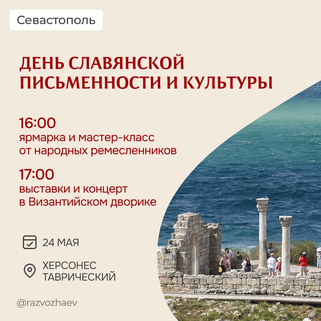 Ко Дню славянской письменности и культуры в музее-заповеднике «Херсонес Таврический» пройдёт праздничная программа В Византийском дворике Херсонеса и на площади пройдут ярмарка ремесел, концерт творческих коллективов, выставки и мастер-классы, сообщил Михаил Развожаев. Вход — по билетам. Для севастопольцев — вход бесплатный при предъявлении паспорта с отметкой о постоянной или временной регистрации в городе. 📺 СТВ 24 | Подписаться