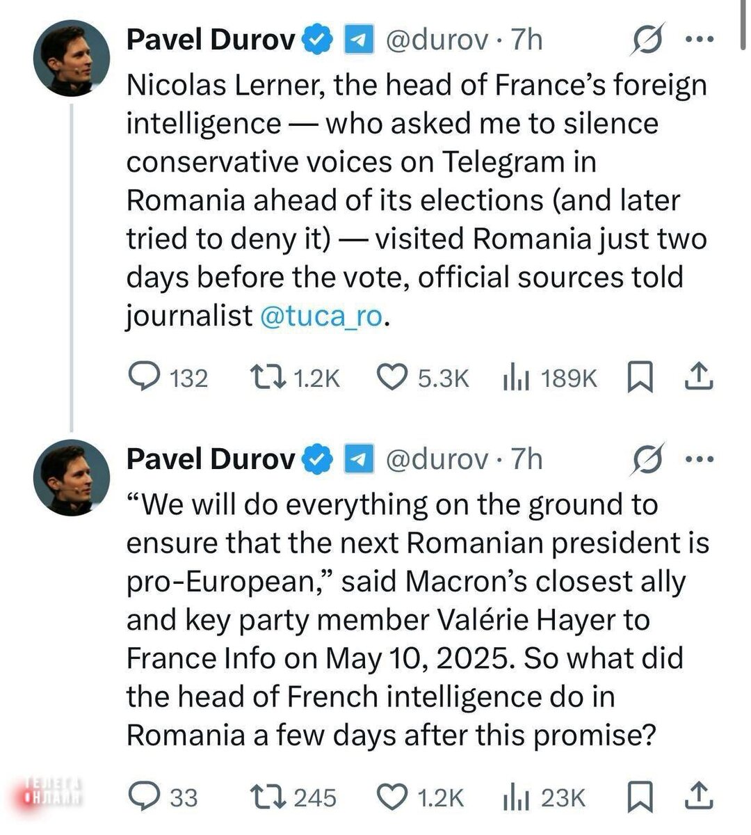 Совпадение? Павел Дуров намекнул на интересный дипломатический туризм: по его словам, глава французской внешней разведки Николя Лернер заехал в Румынию за два дня до президентских выборов. Совпадение? Возможно. Но есть нюанс. Перед его визитом евродепутат и ближайшая сторонница [Эммануэля] Макрона Валери Хайер заявила, что будет сделано всё, чтобы следующий президент Румынии был проевропейским. Так что же он там делал после такого обещания? Просто случайность, конечно. Европейская демократия ведь не вмешивается — она просто приезжает заранее. 🚲 Подпишись на Телега Online
