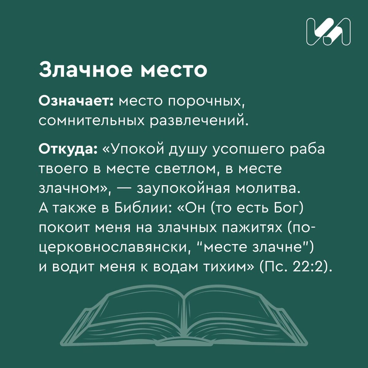 💬 Еще в пушкинские времена злачным местом называли трактир, где отлично могли провести время повесы и гуляки. Так что, как видите, смысл крылатого выражения неверно трактовался уже давно. И все же, в каком таком злачном светлом месте мы просим в молитве упокоить наших ушедших близких? В церковнославянском языке слово «злачный» не является синонимомом чего-то порочного. Злачный, начинающийся с буквы «зело», означает «покрытый зеленью, молодой травой». Так что в молитве об упокоении близких мы просим Господа, чтобы он привел наших родных и любимых в красивое место для вечного отдыха. Этот образ взят из псалма 22, в котором Бог изображается как заботливый Пастырь, который ведет людей, как своих овец, на зеленые пастбища, богатые травой. 📜 В нашей рубрике продолжаем знакомить вас с происхождением большинства распространенных фразеологизмов и рассказываем об их первоначальном смысле. Клевер Лаборатория