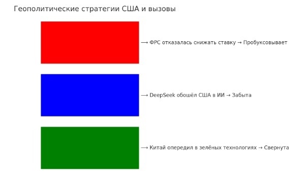 У Дональда Трампа была своя стратегия — превратить США в технологическую сверхдержаву. Заявления об ИИ, дата-центрах, атомной энергетике и триллионных инвестициях звучали громко. Но и тут Китай не дал шансов: нейросеть DeepSeek оказалась дешевле и продуктивнее. Мечта о технодоминации исчезла с радаров.