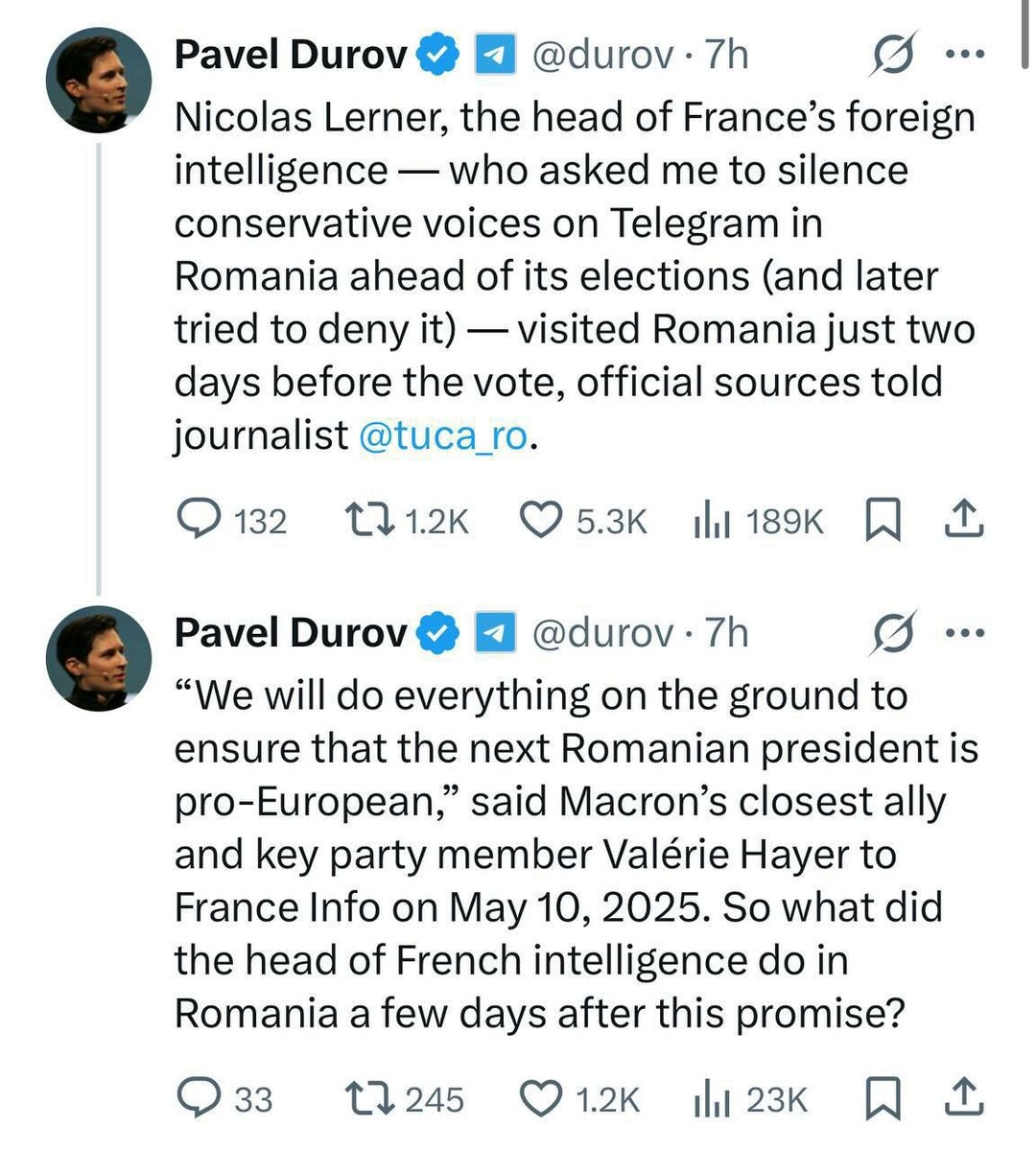 👀 Паша бунтарь просто. Плохо, наверное, проводить каникулы во Франции находясь под следствием. Глава внешней разведки Франции Лернер приезжал в Румынию за два дня до президентских выборов, сообщил Дуров, ссылаясь на румынского журналиста. "Перед его визитом евродепутат и ближайшая сторонница Макрона Валери Хайер заявила, что будет сделано всё, чтобы следующий президент Румынии был проевропейским. Так что же он там делал после такого обещания?", – написал в соцсетях основатель Telegram.