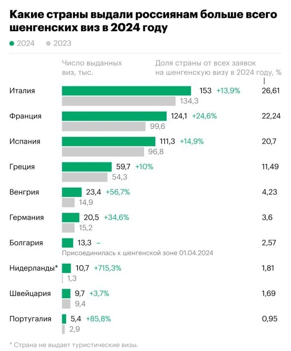 Россияне поехали в Европу — им стали чаще выдавать шенгенские визы. Доля отказов снизилась на 3,1 п.п. в 2024 году. Больше всего виз выдали Италия и Франция. Заря | Новости - Подписаться