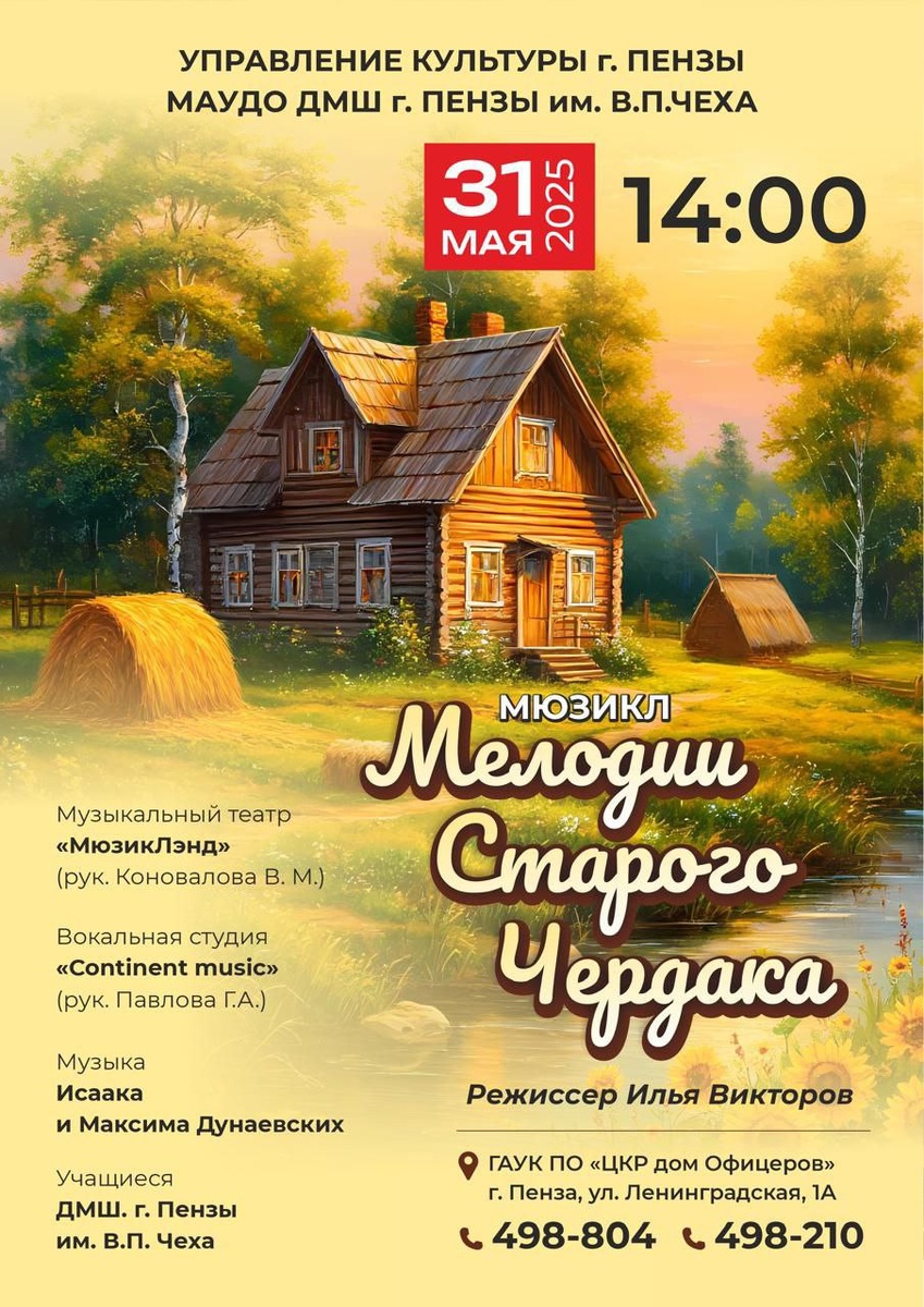 Дорогие друзья! ДМШим.В.П.Чеха 🌟✨ Приглашаем вас в волшебный мир музыкального театра на премьеру нашего мюзикла "Мелодии старого чердака", созданный на основе музыки Исаака и Максима Дунаевских✨🌟 В спектакле заняты ТОЛЬКО дети👭 ✨Погрузитесь вместе с нами в атмосферу мечты и музыки, где каждый ребенок сможет стать частью увлекательной истории. 🌈 Что вас ждёт? - Яркие костюмы и захватывающие сценические постановки! - Зажигательные песни и танцы, которые поднимут настроение! - Увлекательные персонажи, готовые подарить вам увлекательные приключения! 🎟️ Билеты уже в продаже! https://iframeab-pre6692.intickets.ru/seance/60650457/ Не упустите шанс стать частью этого чудесного события! Ждем вас на нашем спектакле — окунитесь вместе с нами в магию музыки Дунаевского! 🎉 #ДМШимВПЧеха #культура58 #penza_kult.