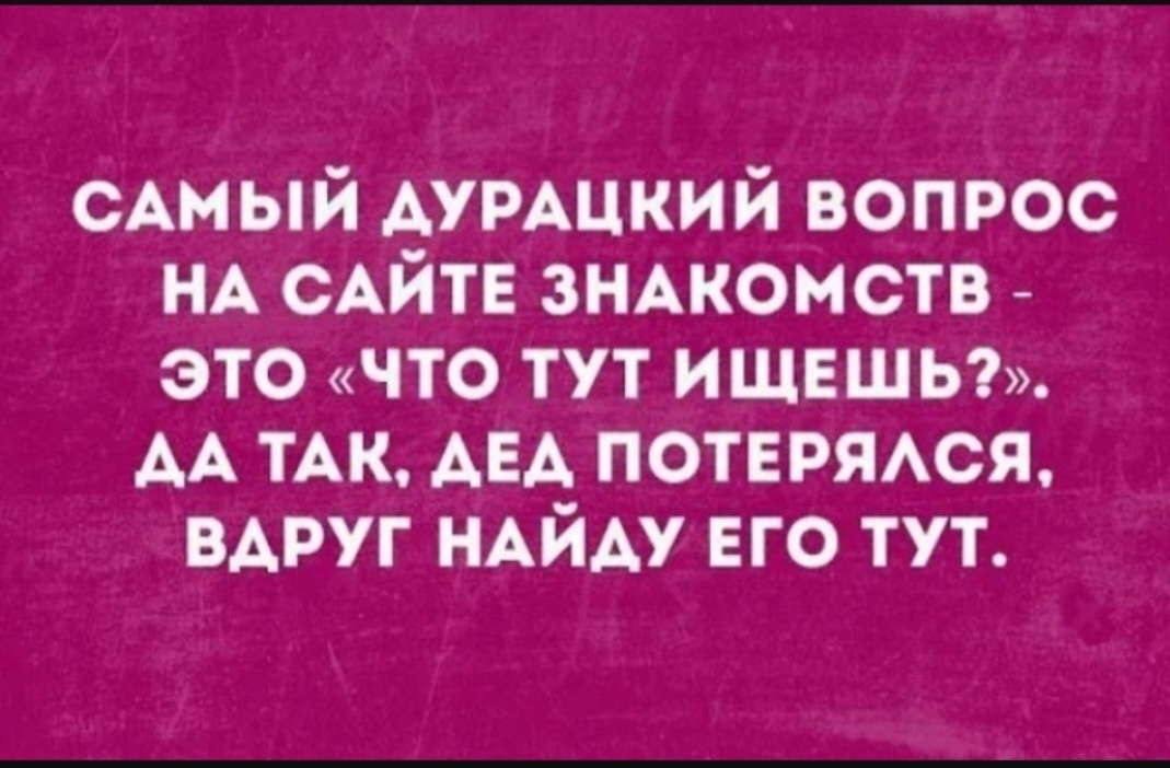 Сказ о том , как Жанна сходила на сайт знакомств. Сидела женщина скучала Решила сайт знакомств посетить. Такое себе развлечение, но а вдруг. Где ещё повстречать мужчину ? Непередаваемые ощущения. Там собрались три категории граждан мужского пола. Мне как человеку наблюдающему, стало любопытно пообщаться с каждой из них. Возможно , мои впечатления поверхностны. Но , как говорится, какое место , такие и впечатления. Если выдержу там хотя бы сутки, поставлю себе зачёт. Два часа назад создала там аккаунт и уже нестерпимое желание его грохнуть. Налетели ж на свежак. Обнять и плакать, но мы поржем. Итак 1 категория Им пофиг на фильтр возраста , тупо лайкают и потом сидят в засаде, ждут что ты кинешься на молодое туловище. 2 категория Сидельцы старожилы Эти сразу пишут тебе сексуализированые приветствия. Типа, че зря время терять, удиви меня. На обычные фразы , а поговорить, или прежде чем ты удивишься, может пообщаемся , у них не срабатывает мозг полностью.Зато срабатывает лобн
