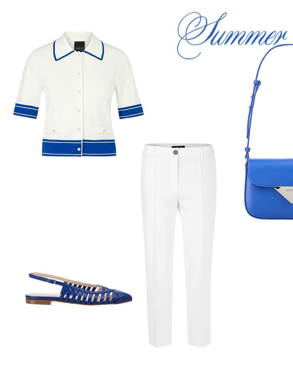 Белое поло с синими акцентами и укороченные брюки — идеальное сочетание для теплых будней. Акцент на аксессуары: синие сандалии и мини-сумка в тон добавляют яркости и свежести.