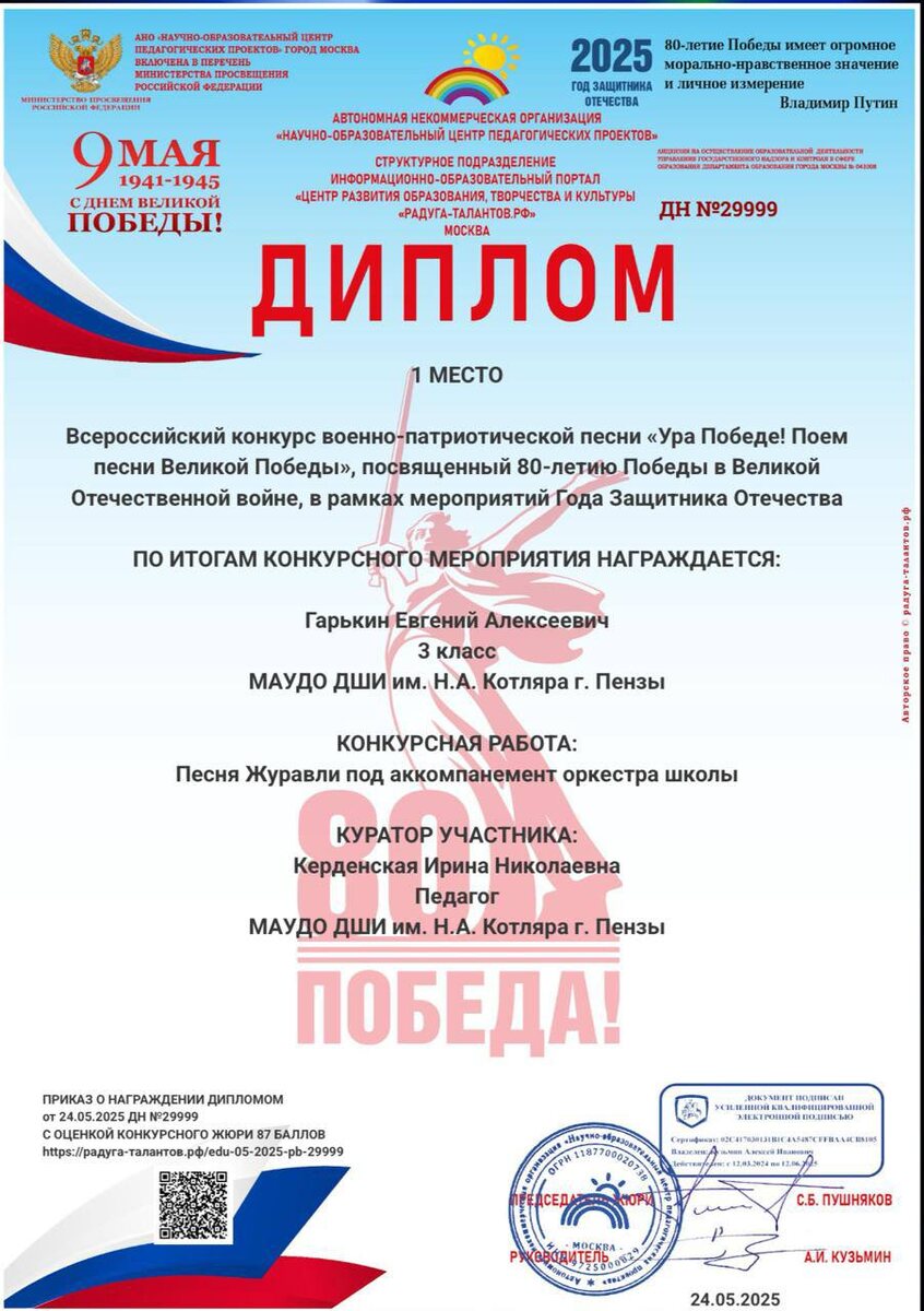 Поздравляем учащегося ДМШ им. Н.А. Котляра Гарькина Евгения - Диплом за 1 место🏆(преподаватель Керденская Ирина Николаевна).
