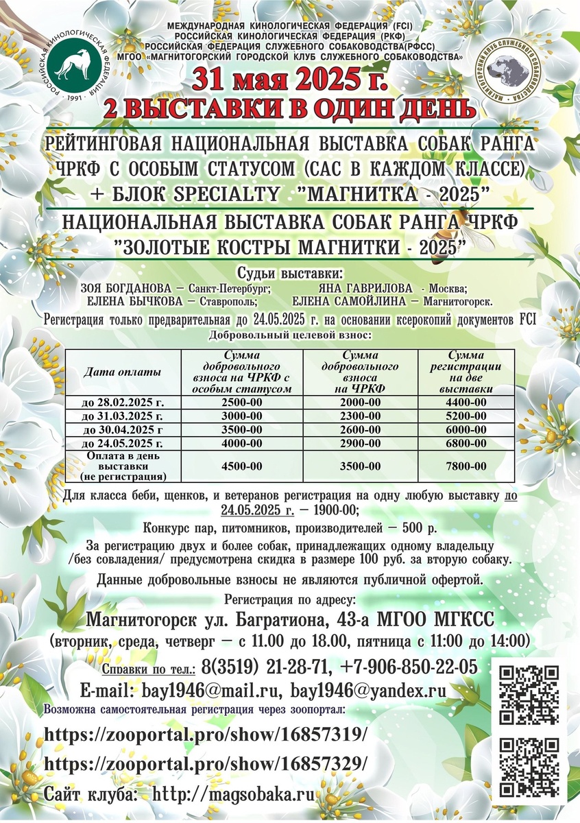 ⏰ 31 май (7д) 🏛 #Магнитогорск #Челябинск #Россия #Выставка 🐶 Выставка собак: МАГНИТКА-2025 🏆 Магнитогорский городской клуб служебного собаководства Контакты организаторов здесь: 🌐 https://www.petsman.ru/vystavki-sobak.php?mesto=210-magnitogorsk Чемпионат РКФ с особым статусом🌟 "МАГНИТКА-2025"🌟 и Чемпионат РКФ 🔥"ЗОЛОТЫЕ КОСТРЫ МАГНИТКИ"🔥 В рамках ЧРКФ ОС "МАГНИТКА-2025" пройдёт большой блок спешалити. 🧑 👨 Эксперты: 🔹 Елена Самойлина 🔹 Зоя Богданова 🔹 Яна Гаврилова 🔹 Елена Бычкова