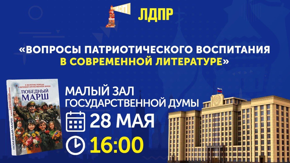 Патриотическое воспитание: разговор депутатов и литераторов 🇷🇺В наши дни все чаще стали говорить о патриотизме. Та общественно-политическая ситуация, в которой сейчас оказалась наша страна, требует появления новых героев, новых ориентиров, четкой и понятной идеологии. К сожалению, зачастую разговоры о патриотизме так и остаются сотрясанием воздуха. В ЛДПР считают, что только говорить недостаточно, патриотизм необходимо воспитывать. 🤔Как и кто это может и должен сделать: родители, школа, государство? Можно ли в принципе воспитать патриотизм? Патриотами рождаются или становятся? 📃Поискам ответов на эти вопросы посвящен круглый стол «Вопросы патриотического воспитания в современной литературе», который состоится 28 мая 16:00 в малом зале Государственной Думы. В дискуссии примут участие депутаты Госдумы и эксперты из Интернационального Союз писателей: писатели, публицисты. В том числе авторы, которые поддержали специальную военную операцию, участвуют в проекте «Родина Zовёт!» и пишут