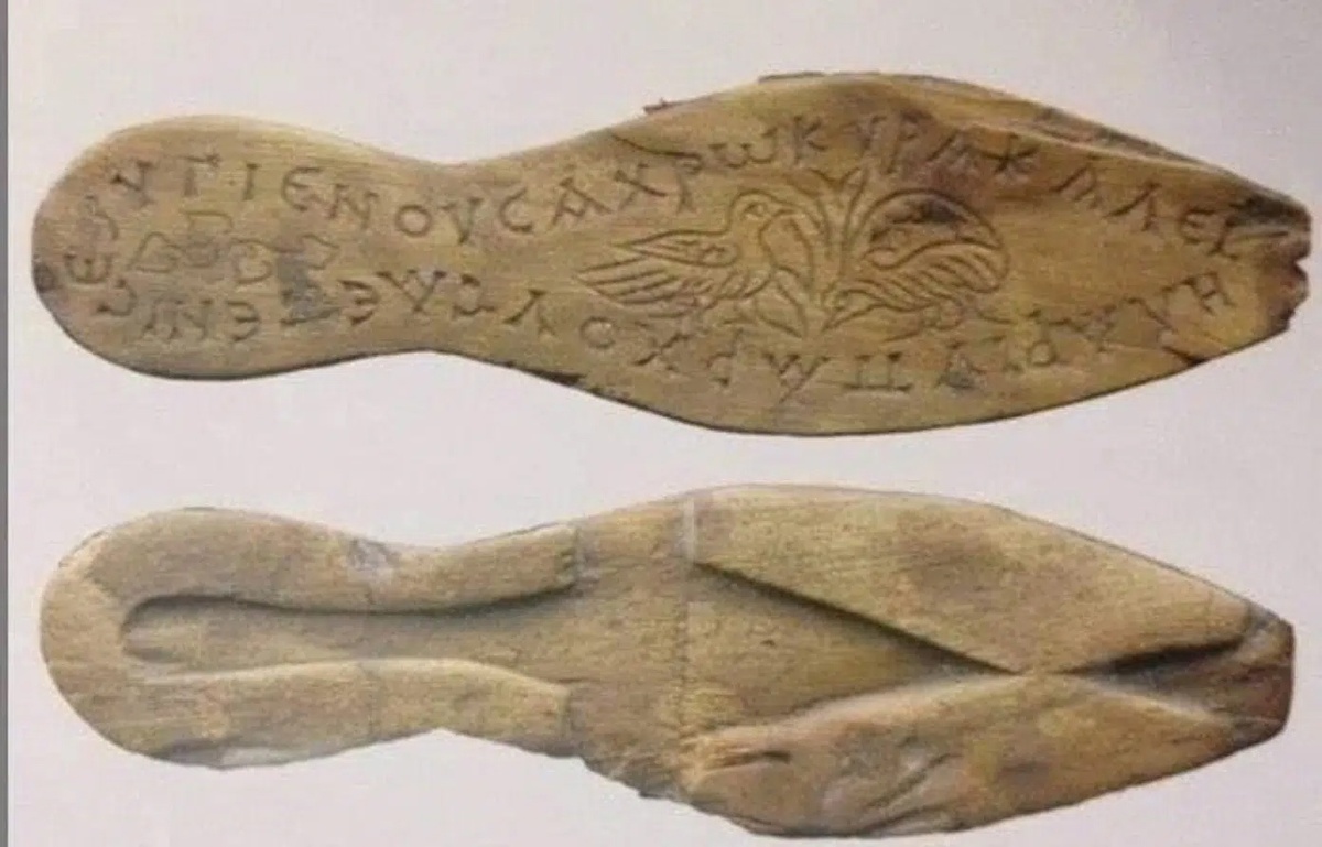 Греческая надпись на одной из подошв гласит: «Используй на здоровье, госпожа, носи в красоте и счастье».